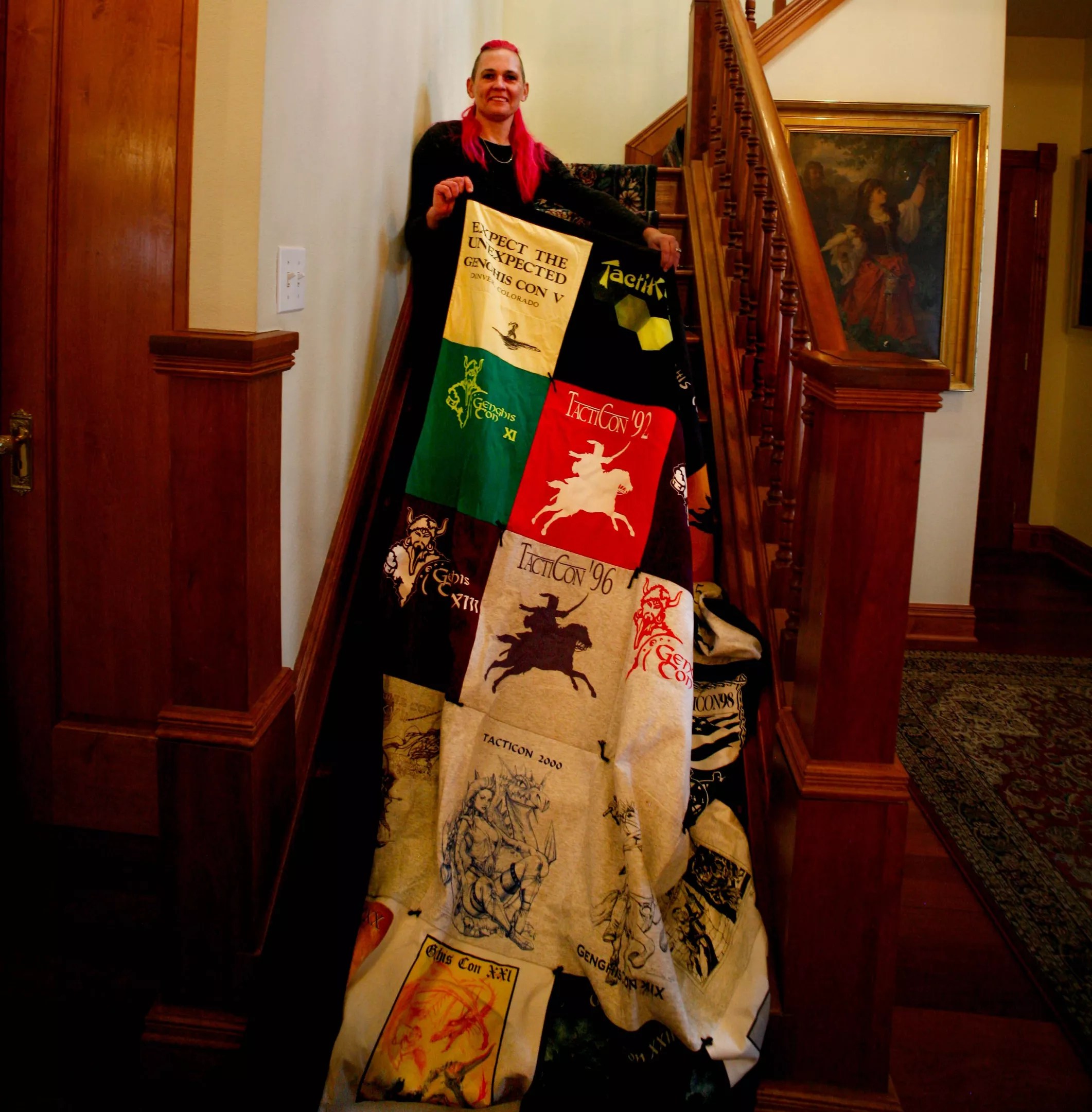 Andre’a Arnold poses with a quilt made from the many convention T-shirts over the decades.