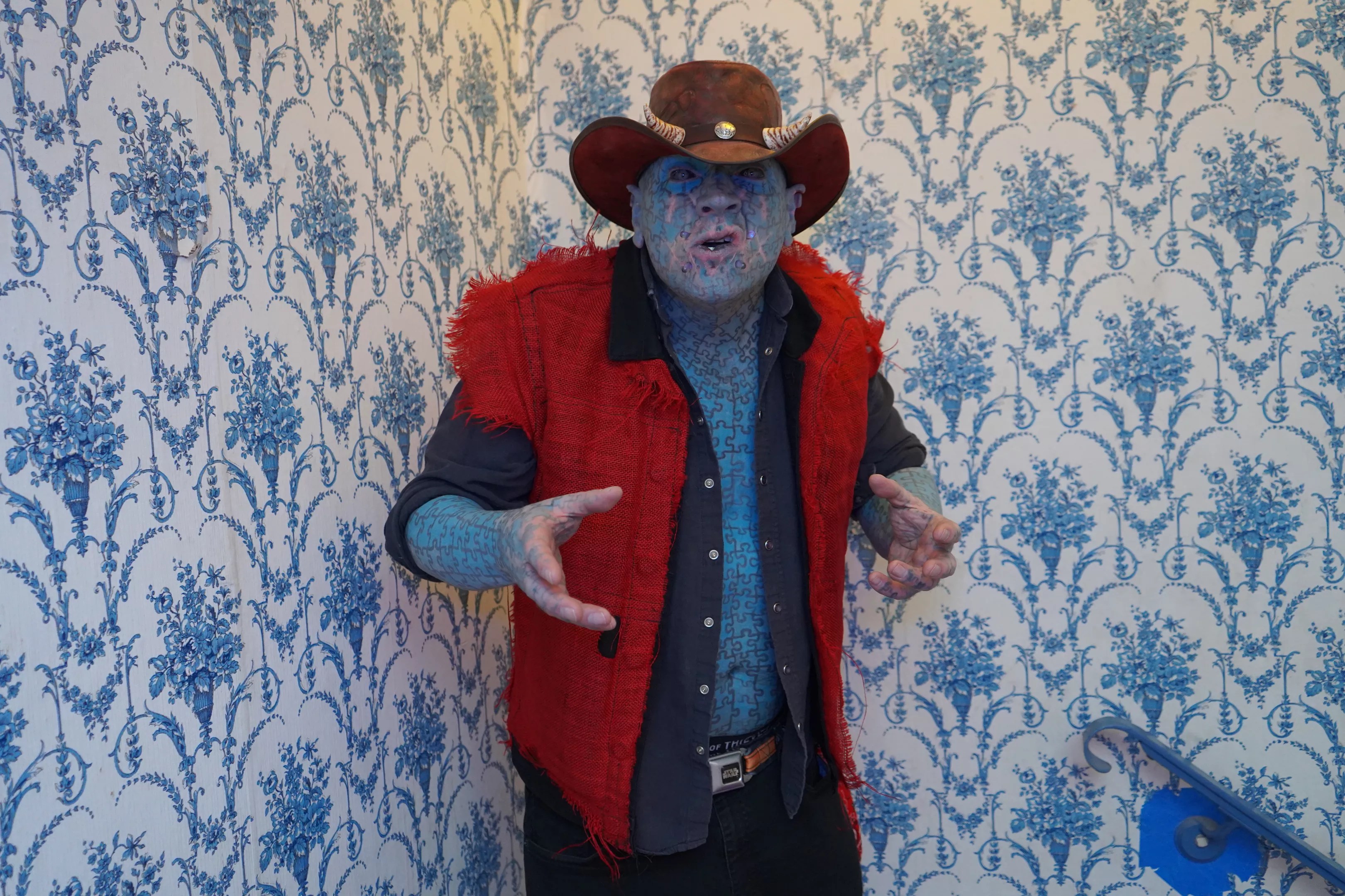 At first glance, The Enigma‘s appearance can be jarring. Reactions range anywhere from wonderment to fright, as the eccentric-looking artist has become famous for his full-body tattoo comprising blue puzzle pieces as well as his affinity for body modification, including getting his eyes tatted and snipping his ears to mimic the jigsaw pattern.