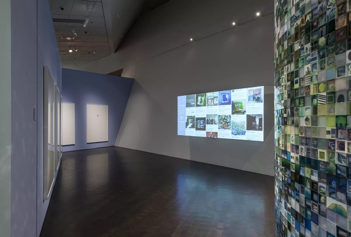 The art-encrusted column is extremely engaging, and the morning I saw it, viewers were studying it for a long time, as was I. The show also includes a suite of individually presented tiny boxes in oversized frames, meant to express ideals in different social realms. And Instagram comes in again now that the installation is finished, in the form of a projection of the constantly changing feed of @utopia_is_free with images tagged #WhatisUtopia or #JonathanSaizatDAM.