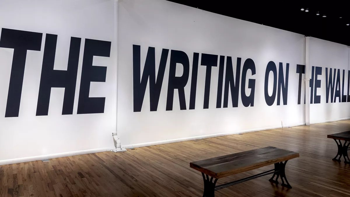 The K Contemporary exhibit is meant to function both as a single work and also as a collection of separate pieces. On one wall, in enormous vinyl letters, is the motto “The writing on the wall”; paintings of ocean waves wrap the other three, many of them simply leaning against the walls. The quote is meant both to raise the issue of climate change and also to refer back to Saiz’s childhood, when he was raised as a Pentecostal Christian (a belief system that he’s long since abandoned), since the quote is from the Bible.