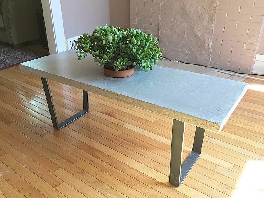 Joshua Ware, coffee table with jade plant, 2018, concrete, unfinished steel, jade plant and terra cotta pot.