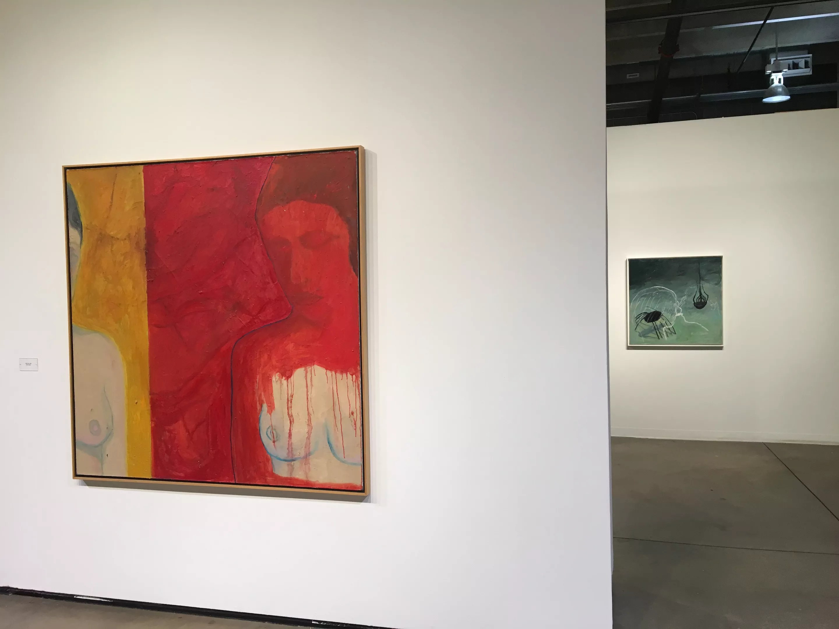 The RedLine display is Neumann’s largest and most significant exhibition, though, and it’s magisterial. The show was curated by Simon Zalkind, who has known Neumann for forty years. Zalkind looked over Neumann’s oeuvre and selected works dating from the 1960s up through pieces created this year. In his exhibition design, he chose not to arrange the works in chronological order, but to instead put together those that resonated visually. Zalkind’s seasoned eye for aesthetic relationships is the key to his success as a curator. Interestingly, despite this visual gift, Zalkind is probably more interested in the dark psychological narratives suggested by Neumann’s paintings, and it was this quality that first attracted him to her efforts. I see Neumann as part of the international neo-expressionist movement of the ’70s and ’80s, though Zalkind disagrees. Despite absorbing a range of influences, he says that Neumann has arrived at a point of view all her own, and that’s unquestionably true.