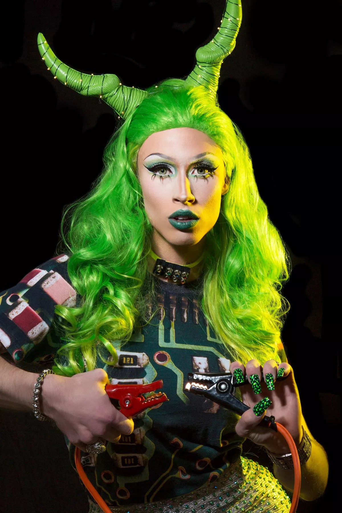 The origin of Mani Queen (aka Andrew Cronk, 24) oddly didn’t begin with a face at all. Mani was a performance concept, a living mannequin in a head-to-toe black bodysuit with no features save for a pair of brightly colored lips for syncing. That’s enough for a couple of numbers, but entering into the world of drag begs for a mastery of makeup arts and of creating multiple paintings over the same familiar canvas. When faced with this challenge, Mani dove in face first. She brought her existing painting skills to the forefront, creating a dark, beautiful creature that is equal parts gore and gorgeous. Once the face was freed from the bodysuit, the rest of her body followed – except for her knees. Andrew was born without knee caps, which you’d never know by watching her high-heeled fantastical performances. Drag can exacerbate her leg strain, kicking up her feet, whether they’re in ten-inch heels or cloven hooves. As a member of the Haus of Lost Causes, Mani is turning her whole life into a work of art.