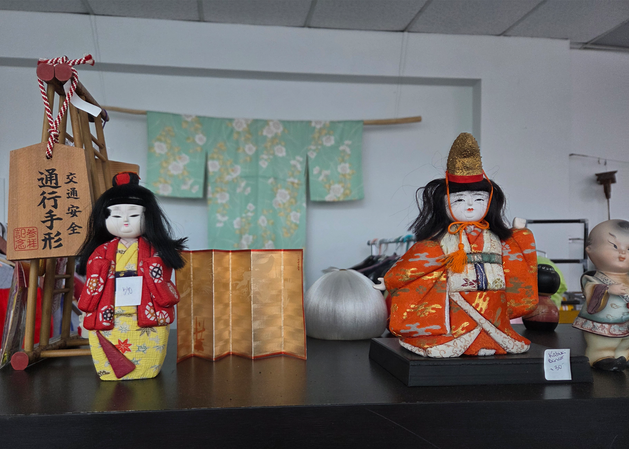 But “as we gathered more and more things, we realized we couldn’t continually store it, unbox it for a sale, unbox it back up and then store it,” she says. “So the Foundation and the LLC at Sakura Square have found space for us to have a little storefront, which we open now once a month.” The shop is currently located on the second floor of the complex and usually holds its monthly sale on the last or second-to-last Sunday of the month. Although Nikkei Treasures now has a permanent location, space is still limited, meaning that its ample doll collection has yet to receive a full display – until now.