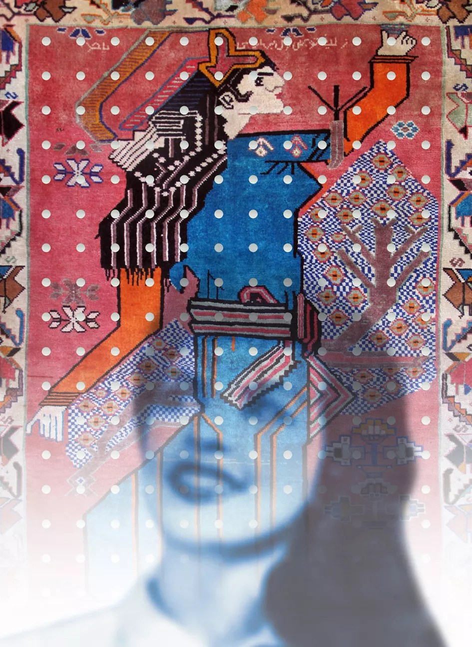 Samira Alikhanzadeh, “No. 4 Stroll Inside Qashqai Carpet,” from the “Mirror Garden” series, digital print on Plexiglas, mirror and Qashqai carpet.