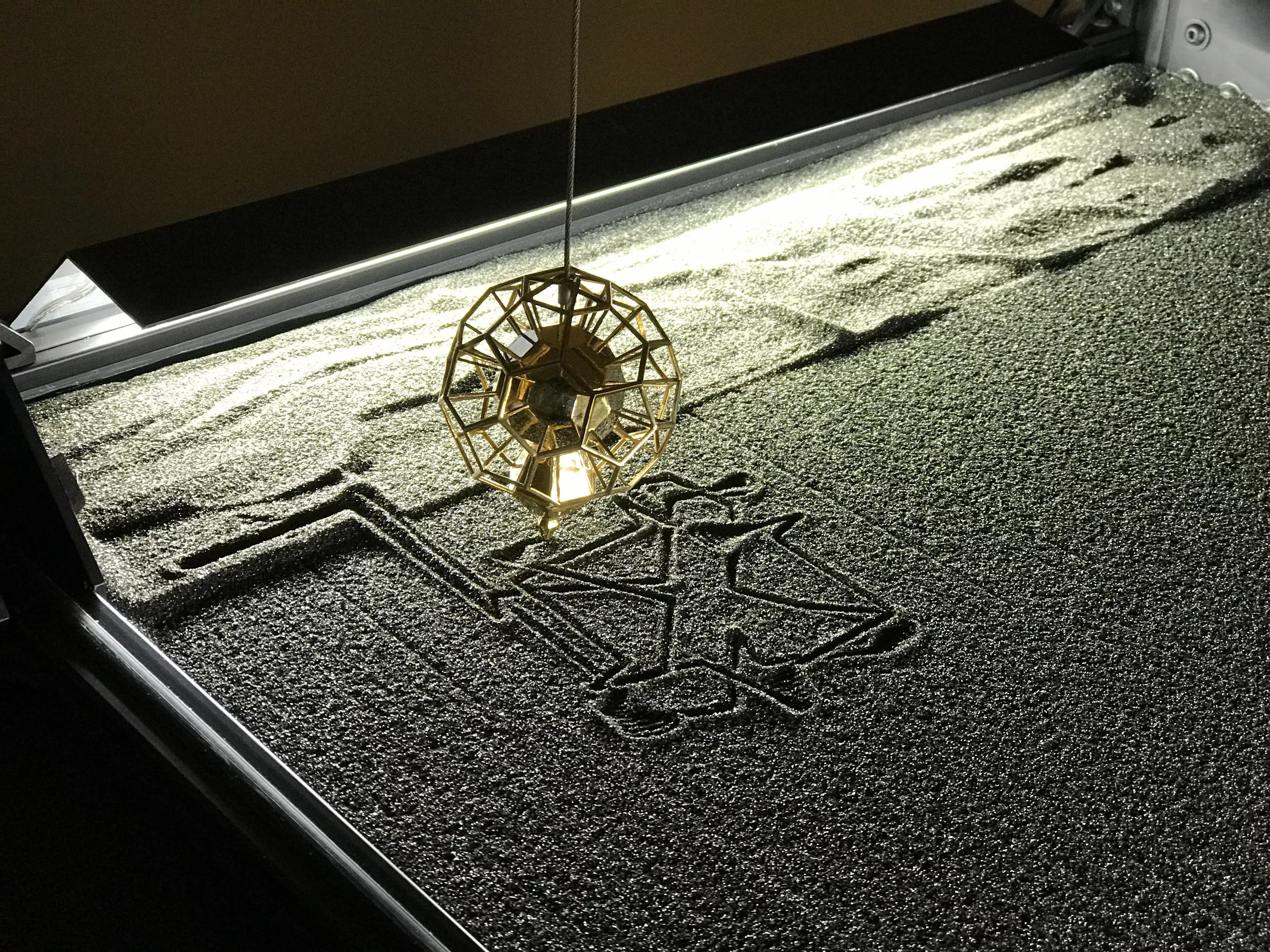 Patterning also turns up in Denver-based Iranian artist Laleh Mehran‘s more compact version of her room-sized installation “Entropic Order” (shown in 2014 at the Arvada Center). The work utilizes a high-tech drawing machine programmed to perpetually re-create an arabesque pattern in a tray of sand. A statement on how history repeats itself? You’ll have to decide.