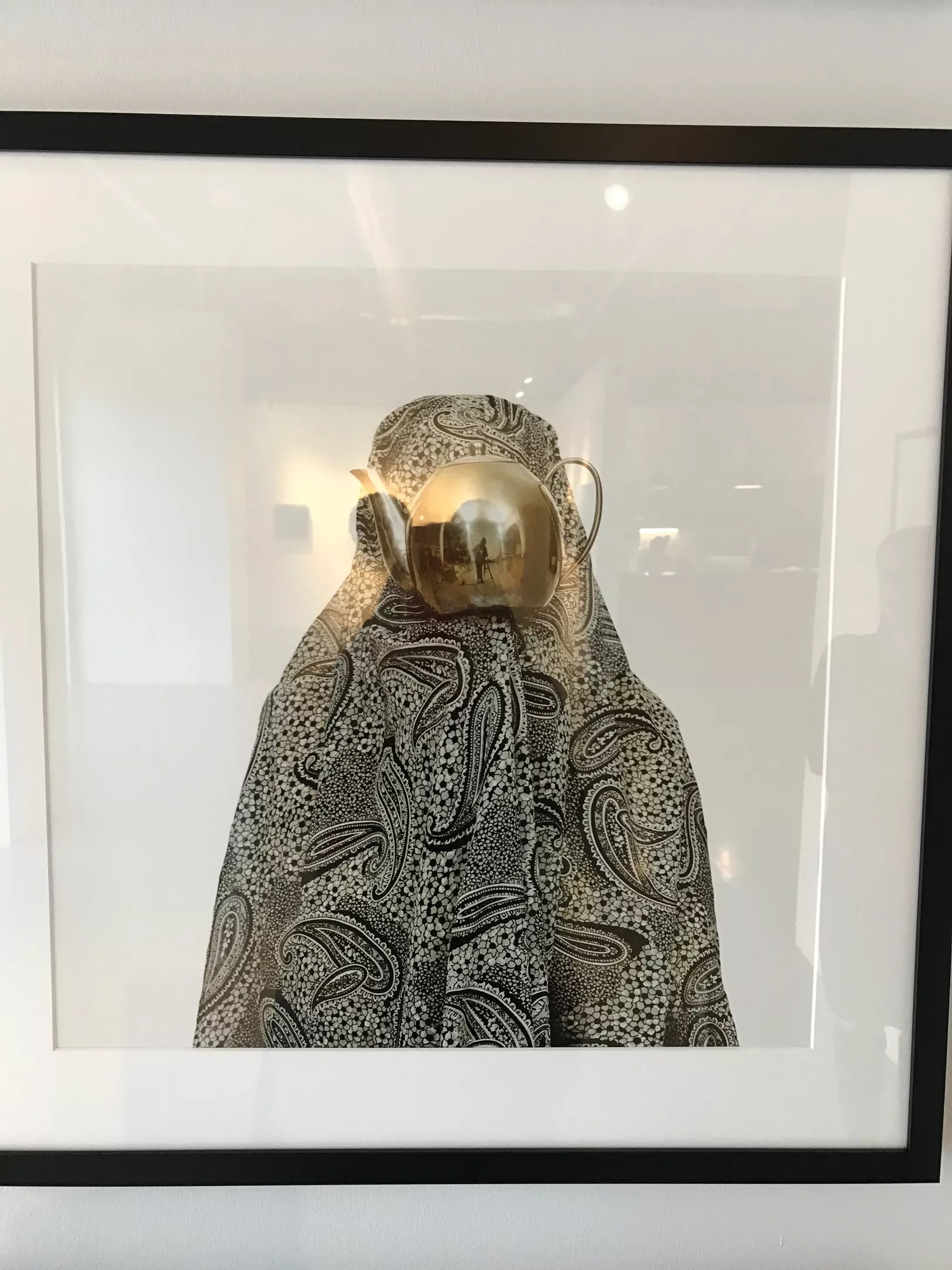 In the work of Shadi Ghadirian, for instance, veiled Muslim women are reduced to their cultural accoutrements, their covered faces further obscured by kitchen utensils. But, notes Cullen, tiny images of Ghadirian in her studio are sometimes reflected in the sides of those teapots and cleavers, exposing a sliver of the modern woman hidden behind the veil – if you look closely. Other works in the show follow suit by obscuring magazine pages under intricately handcut, mosaic-inspired patterns (Samira Yamin) or overshadowing imagery in meticulously cut and interwoven photographs (Golnar Adili).