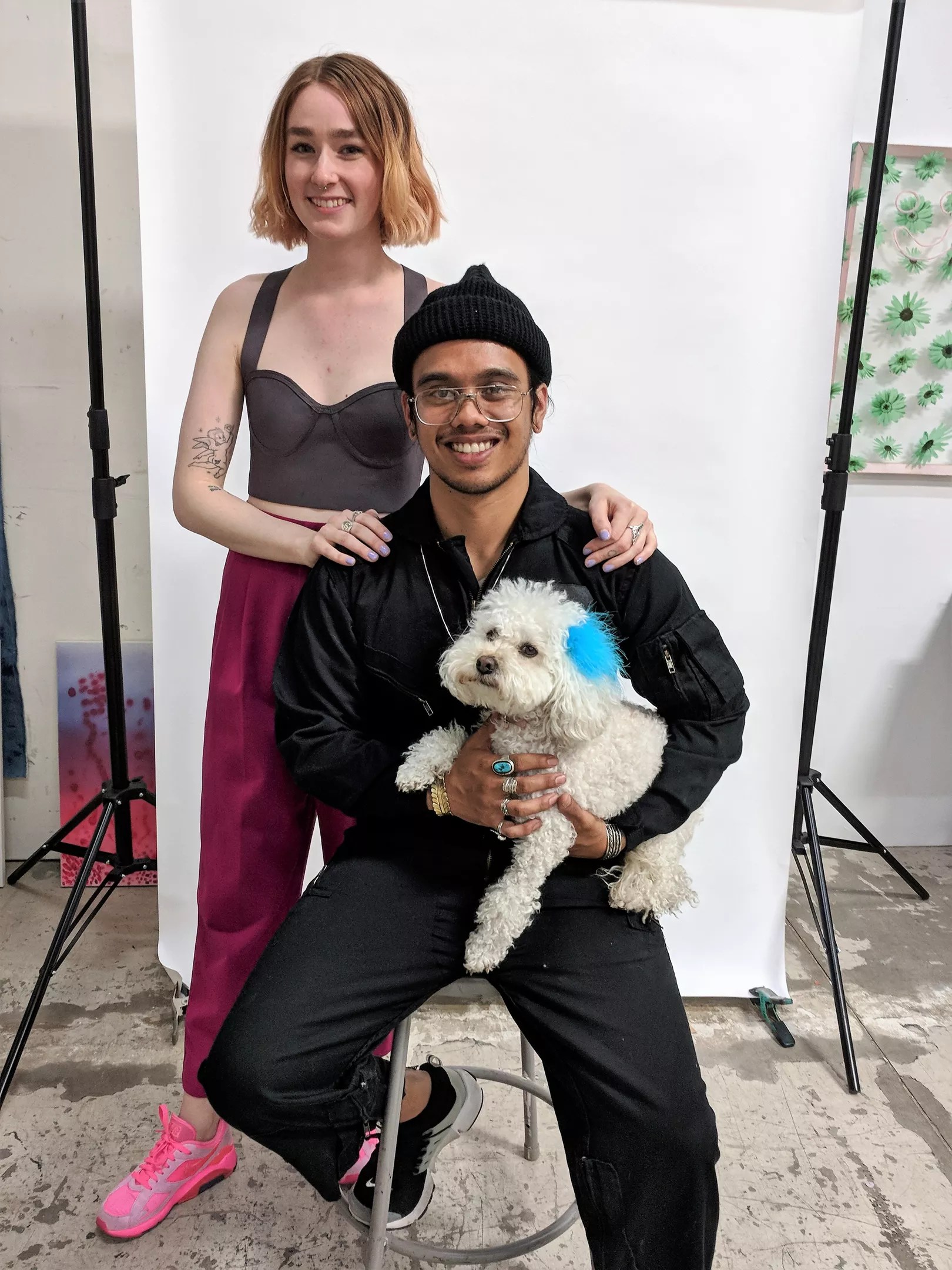 Meredith MacNicholas and Alexander Ablola with their studio dog, Leche.