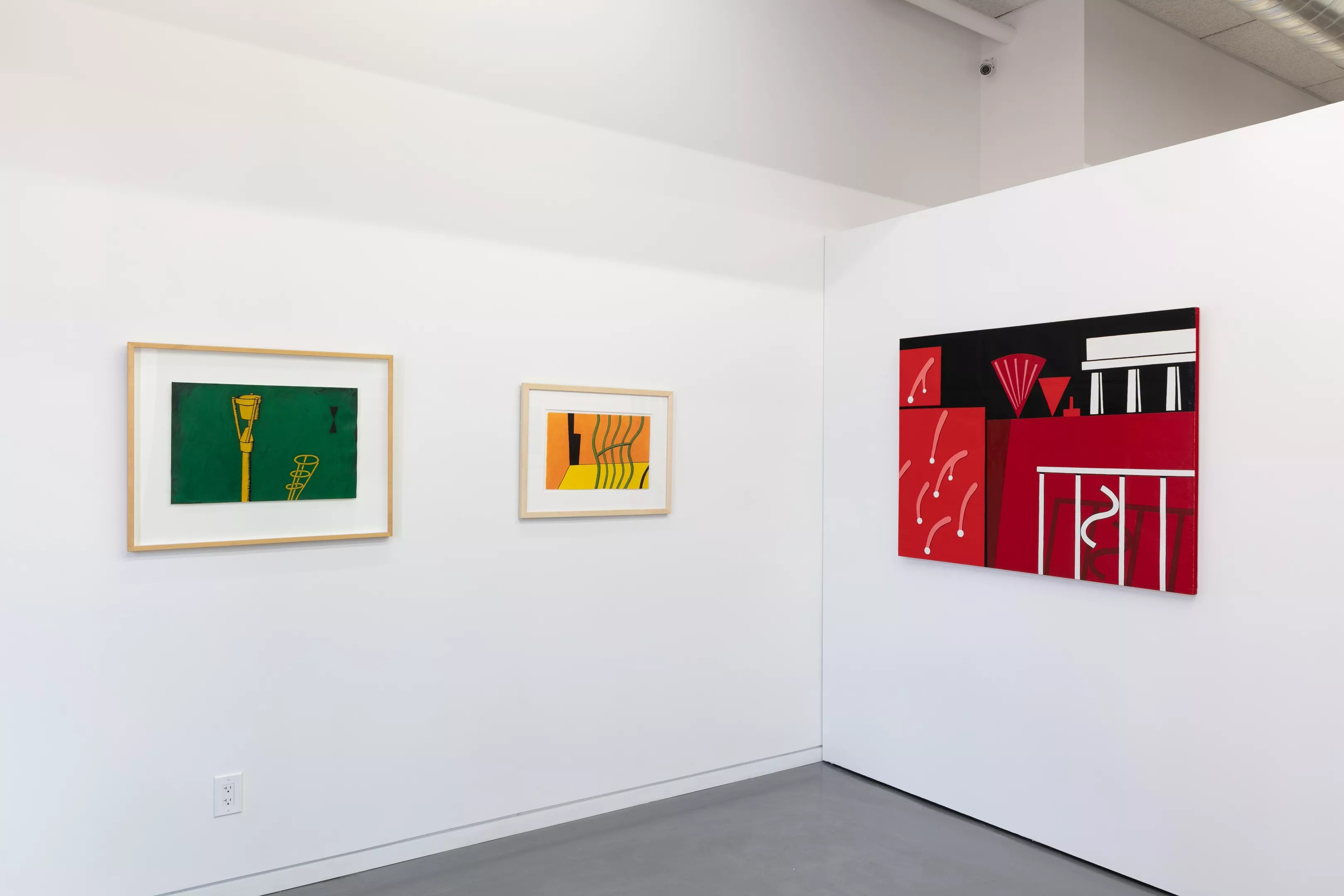 The show comprises older paintings as well as more recent works on paper. Astoundingly, Clower was so far ahead of the pack and everything looks so fresh and new, the pieces could have been done just last month. His distinctive style includes simple compositions, sometimes with cartoonish conventionalized depictions of recognizable things reduced to their most minimal expression. A good example is “Roadside Scene,” in which a flying saucer glides over a ziggurat pyramid; the monument, in rich shades of green, is set against a taxicab yellow. “Chaos Hell of Ecstasy,” in enamel on tin panels that have been tiled over a wooden board, has a neo-classical air, with a partly hidden colonnade and what looks like a section of iron fence. The palette is fire-engine red against black and white. These colors are so sharp and clean, and the painting has such a contemporary feel, it’s surprising to learn that it was painted more than twenty years ago.