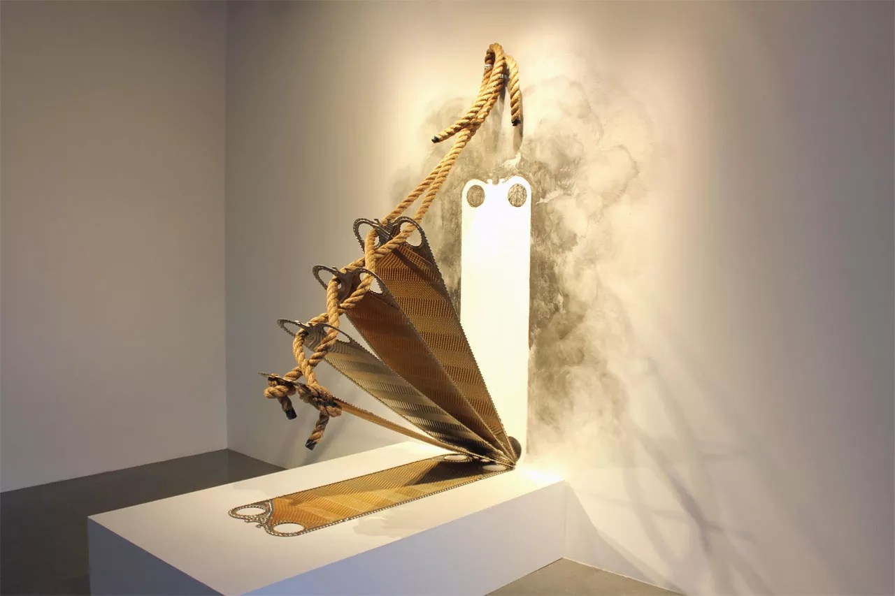 Much more abstract is another installation, “Bound,” a series of flat metal sheets that had originally been stamped to make radiator parts but were then scrapped. The sheets are suspended in a bellows-like sequence, held together by the kind of heavy rope you’d use to tie a boat. The form suggests a machine, implying movement, but the rope establishes that the contraption is static. The imagery is clear: The exploited laborer, an indentured servant in the context of this show, is bound to the job. Combined with “Purity test,” “Bound” suggests how dirty the plantation’s field hands would get in the normal course of their work.
