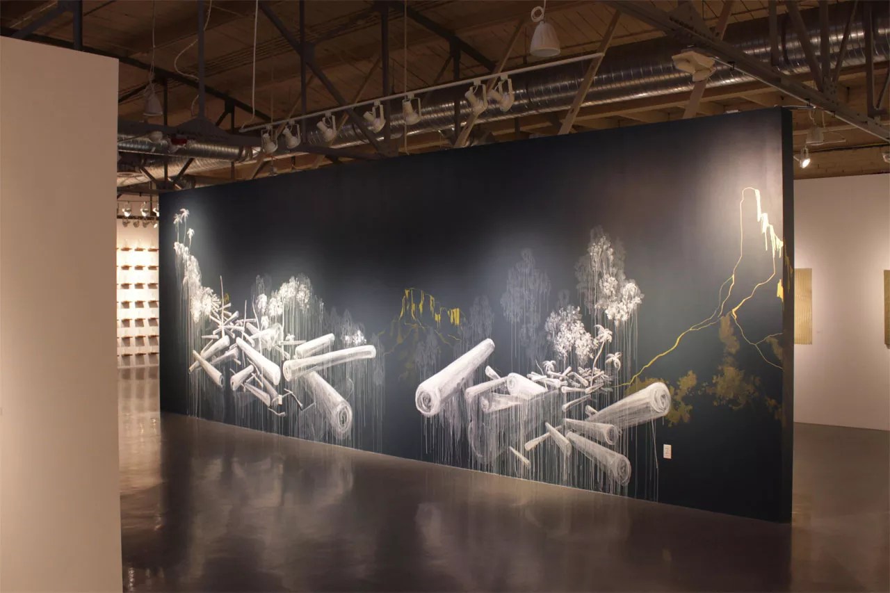 In “Clearing,” a painting that’s applied directly to the wall, Mattai deals with the exploitation of colonized land, depicting the clear-cutting of a tropical forest. The contours of the landscape are sketched out in white and yellow on a rich gray ground. Then, using a runny white paint that drips freely below the imagery, Mattai painted fallen logs in the foreground, while trees that are still standing fill the background. So you can add the environment to the concerns the artist addresses here.