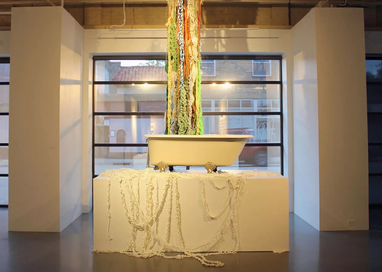 The show gets off to a strong start with the installation “Purity test,” in which a “shower” of tied, twisted and crocheted yarn mounted on an armature suspended from the ceiling creates the suggestion of falling water flowing into an actual bathtub, one of those old-fashioned ones with claw feet. The bathing reference relates to the racist idea that non-white people are dirty and must be cleaned and thus purified. But the work’s title refers to another racist conceit, that of racial purity: Colonized peoples were regarded as impure, and thus inferior, because they were not descended from Europeans. Many of the other works in the show use similarly recognizable objects in combinations that reinforce Mattai’s conceptual efforts to deconstruct prejudice.