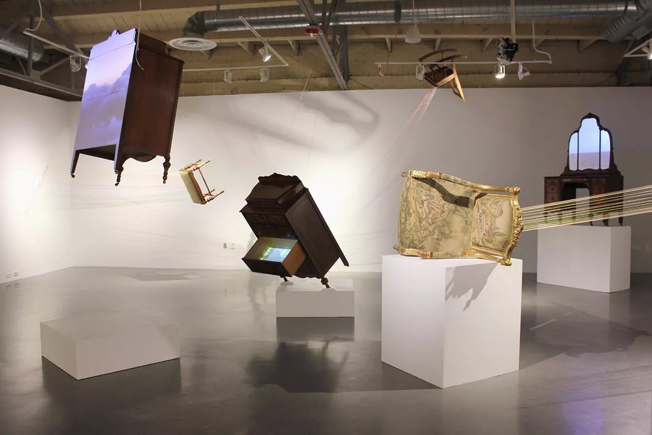 The show reaches a climax in the back gallery, which is completely dedicated to an enormous installation, “Sugar water,” made up of antique bedroom furniture, chairs and video projections. Several pieces of the furniture, including a dresser that seems to float above our heads, are suspended by thin wires from the ceiling; some are connected to the walls with rainbow-colored yarn. Others, like a big gold chair, have been knocked over. It looks like the room is exploding. Videos of landscapes are projected onto some of the elements, such as the vanity’s three-part mirror, whose glass has been replaced with white panels. “Sugar water” captures the immigrant experience: In a physical sense, it refers to having to move furniture from place to place, but metaphorically, it has to do with the disconnections, displacements and disorientations inherent in someone leaving their home country for a potentially hostile one – hence the destruction suggested by the “flying” furniture.