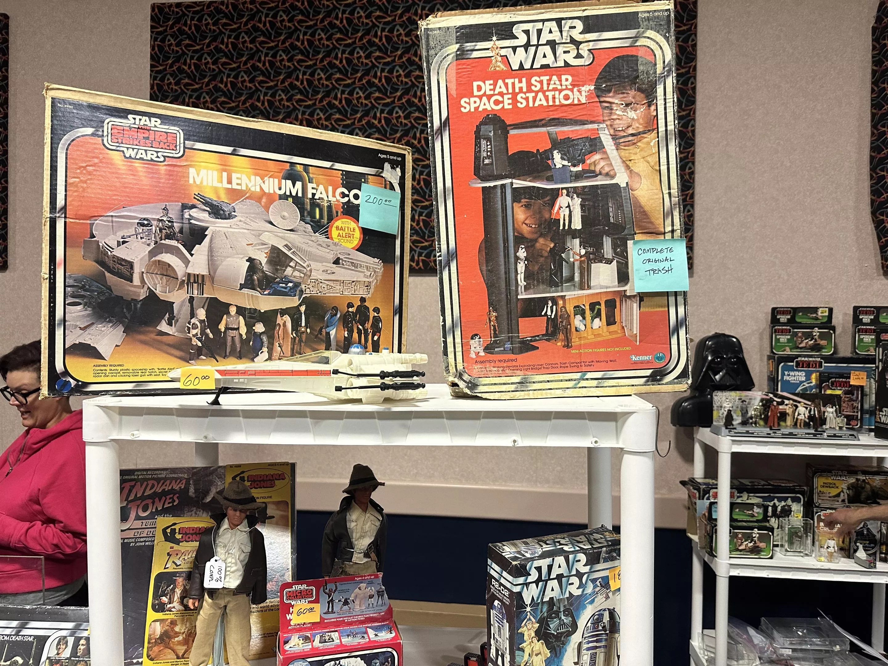 There was a decent amount of Star Wars merch all over the show, but not much of it was vintage. This vendor was the exception, with not only original ships and sets and figs, but some still in their original boxes. Sixty bucks for an original X-Wing seems totally reasonable, as does $200 for an original 1980s Millennium Falcon. The Death Star box has seen better days, but it looks like it’s all there, right down to the “complete original trash” from the compactor – little orange and blue pieces of foam that in most sets have withered to dust by now. And bonus: original Indiana Jones dolls? Sure, they look a little bedraggled, but like Indy says: “It’s not the years, honey. It’s the mileage.”