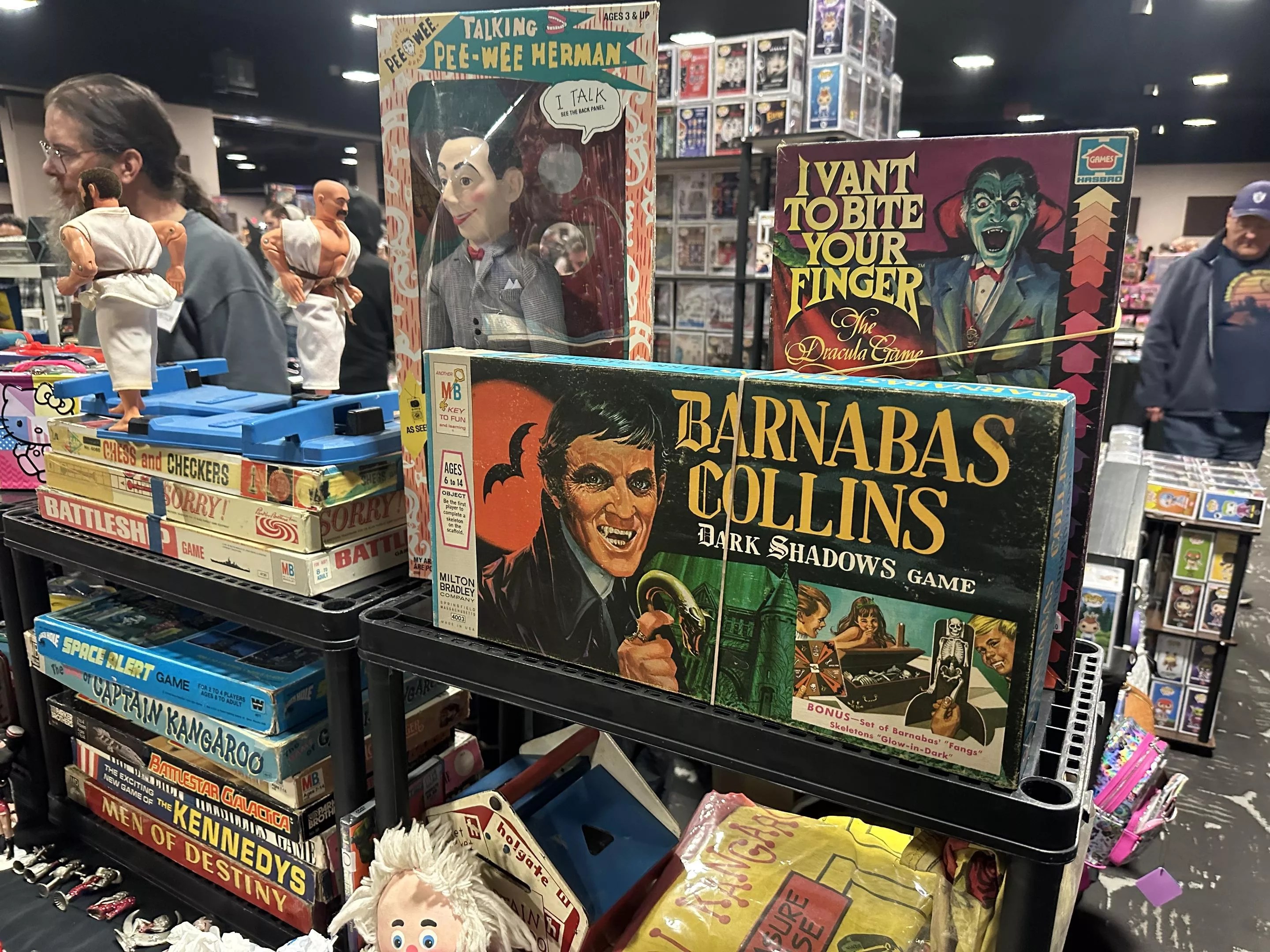 Over on the left we have old standbys like Battleship and Sorry along with games we’ve never heard of but would love to try: Captain Kangaroo? Battlestar Galactica? The Kennedys? And that’s all crowned with a G.I. Joe Kung-Fu version of Rock’Em Sock’Em Robots. And next to the late, great Pee-wee Herman, two very cool (and probably very different) vampire games – one from 1969, and the other from a decade later. Hours upon hours of fun right there. (And Pee-wee can watch.)