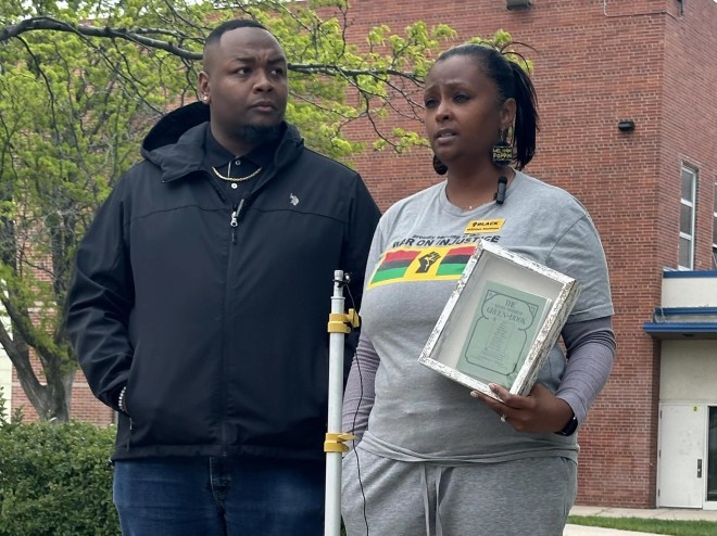 Auon’tai Anderson and MiDian Holmes attended the Englewood school board meeting on Tuesday night to send a message through silence.