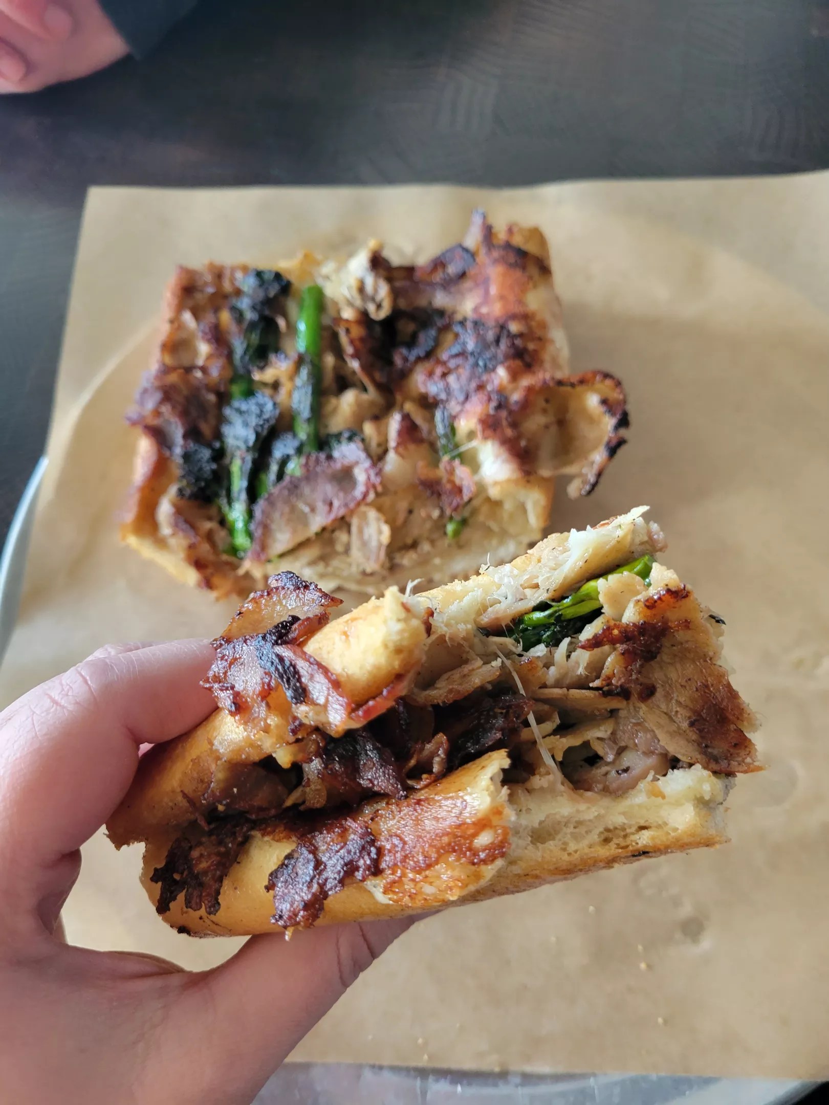 The Philly, for example, comes piled high with thinly sliced sous vide steak that’s finished in a hot cast-iron pan. It’s then chopped with a housemade cheese sauce that Cherrett creates using heavy cream steeped with thyme and garlic, and American cheese folded in. The roast pork also gets extra love, as the pork filet cures for two days before being roasted, sliced and topped with charred broccolini, melty provolone and a dollop of umami-rich jus.