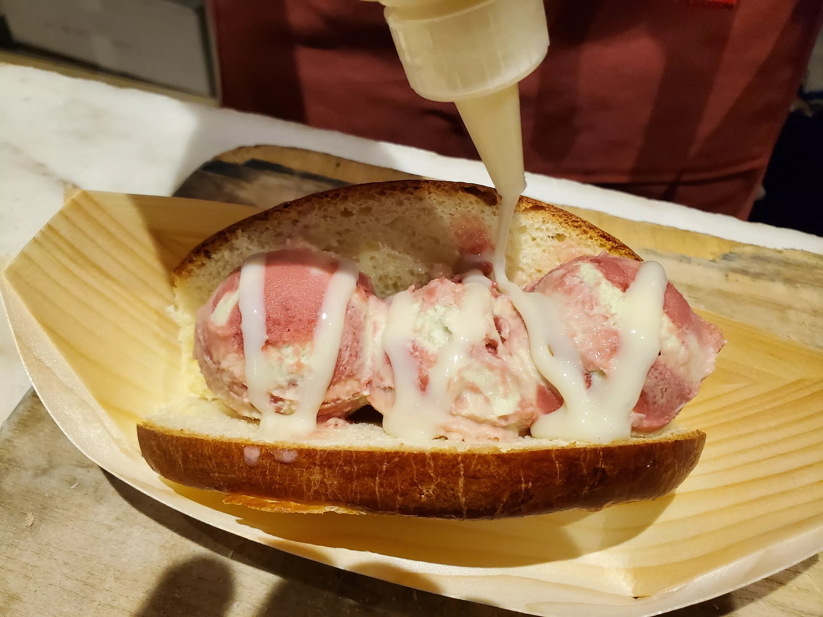 Drizzling condensed milk onto a Thai ice cream sandwich.