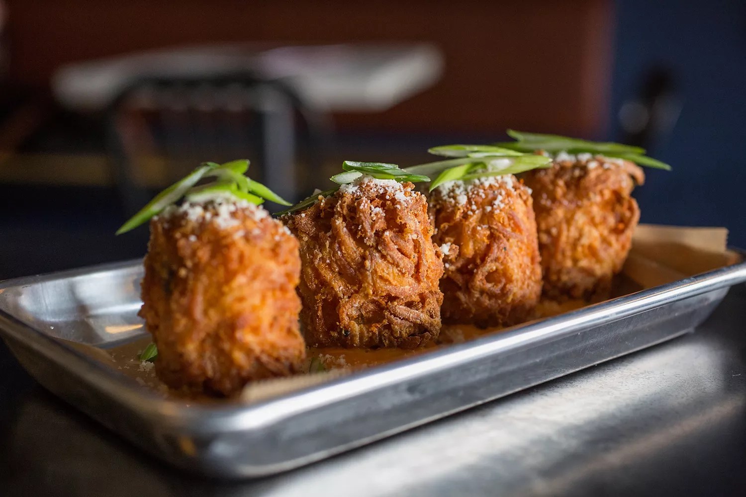 That team is turning out a menu of American fare, built on pickles, charcuterie and bread all made from scratch. “This is about things done well but simple,” says Bray. There’s a classic cheeseburger, made with short rib but topped with American cheese and housemade bread and butter pickles; and there’s fried chicken, brined in citrus and buttermilk for four days before it gets a gluten-free dredge that chef de cuisine Jordan Rickard says is “audibly crispy.” Snacks range from a charcuterie board with house-cured maple bacon and homemade pimento cheese to adult tater tots with sour cream and cheese.