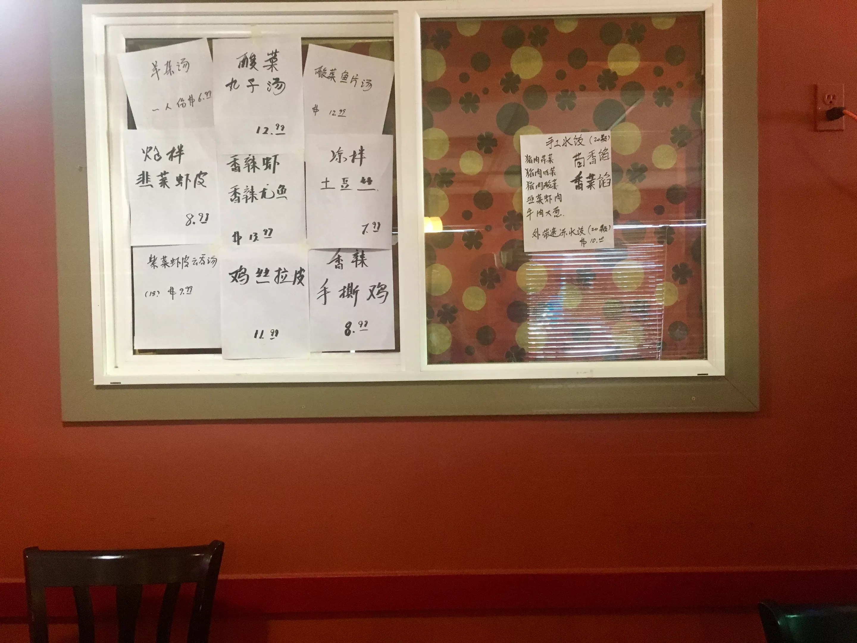 The dining room at Lucky China is small and simply decorated, with three big fish tanks providing most of the ambience. As you walk around the fish tank at the entrance to be seated, you may notice several signs written in Chinese with dollar amounts next to them. These are the “try it out” specials that aren’t on the menu, but if you ask your server, he or she will tell you about them. I saw many patrons order from this specials board; the dishes came out piping hot on metal carts and looked tasty and freshly made.