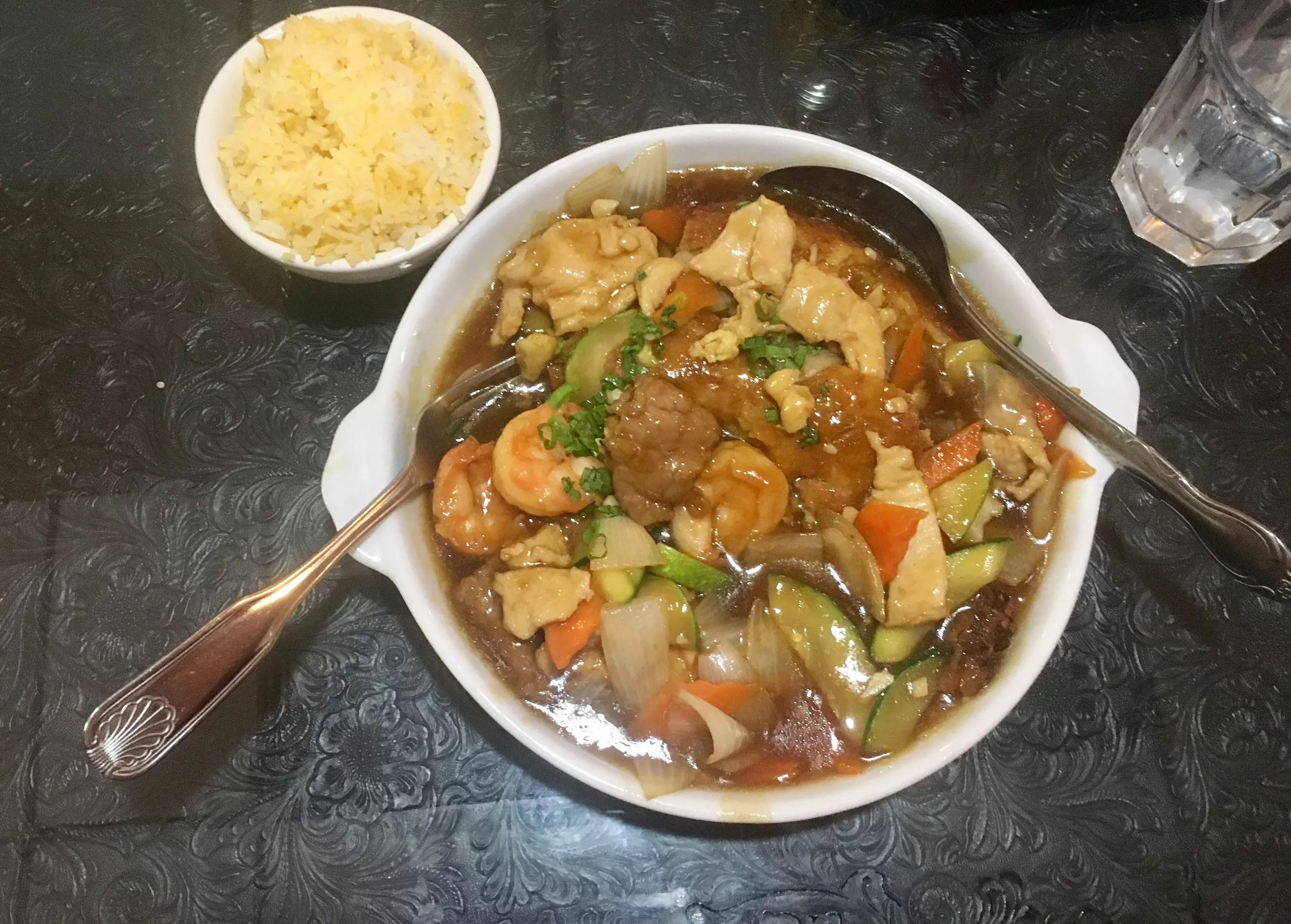 Many dishes at Lucky China reflect alteration for a different clientele, and if you’re in the mood for American-Chinese fare, I recommend the surprisingly light combination egg foo young ($10.99). The eggs are fluffy and contain bits of tender meat, cabbage, onions and zucchini throughout. Large chunks of shrimp, pork, chicken, beef and perfectly cooked veggies are layered under a savory gravy and heaped onto a four-inch deep dish to hold an impressively large and piping-hot portion. When she brought it to my table, my server immediately said “You’ll need a box – I’ll go get it for you” before I even took my first bite. Indeed, this dish, like many others served at Lucky China, including appetizers, could be split between two, three or even four diners. So bring a companion, or be prepared to feast on delicious leftovers for a couple of days (not that this is a problem).