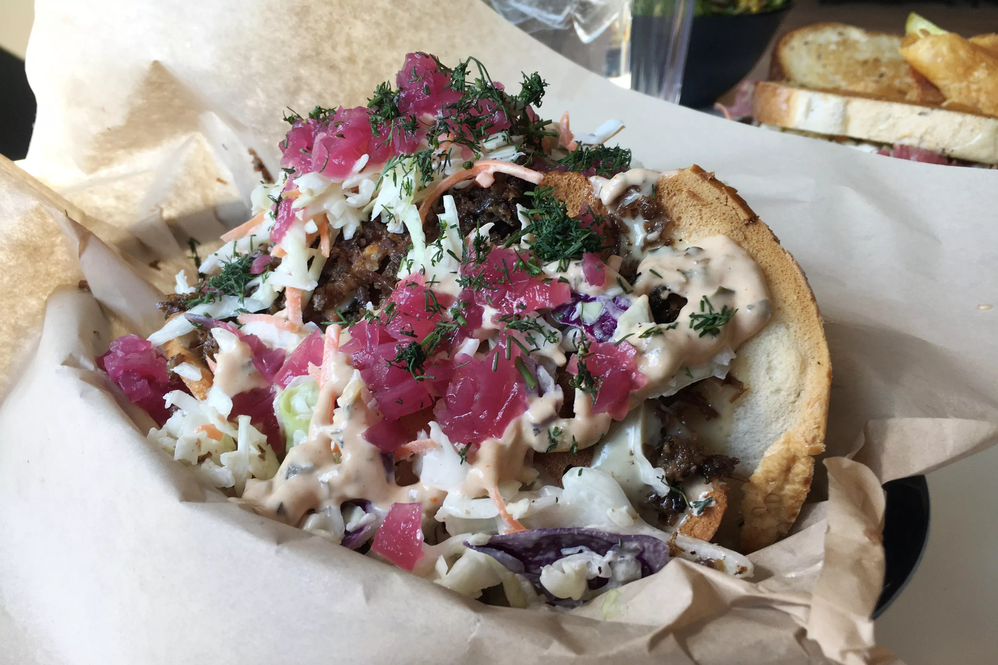 So expect matzoh ball soup, latkes, Reubens and breakfast sandwiches on New York City bagels, as well as items unique to this location such as everything-spiced tots and Jewish nachos that use bagel chips instead of tortilla chips.