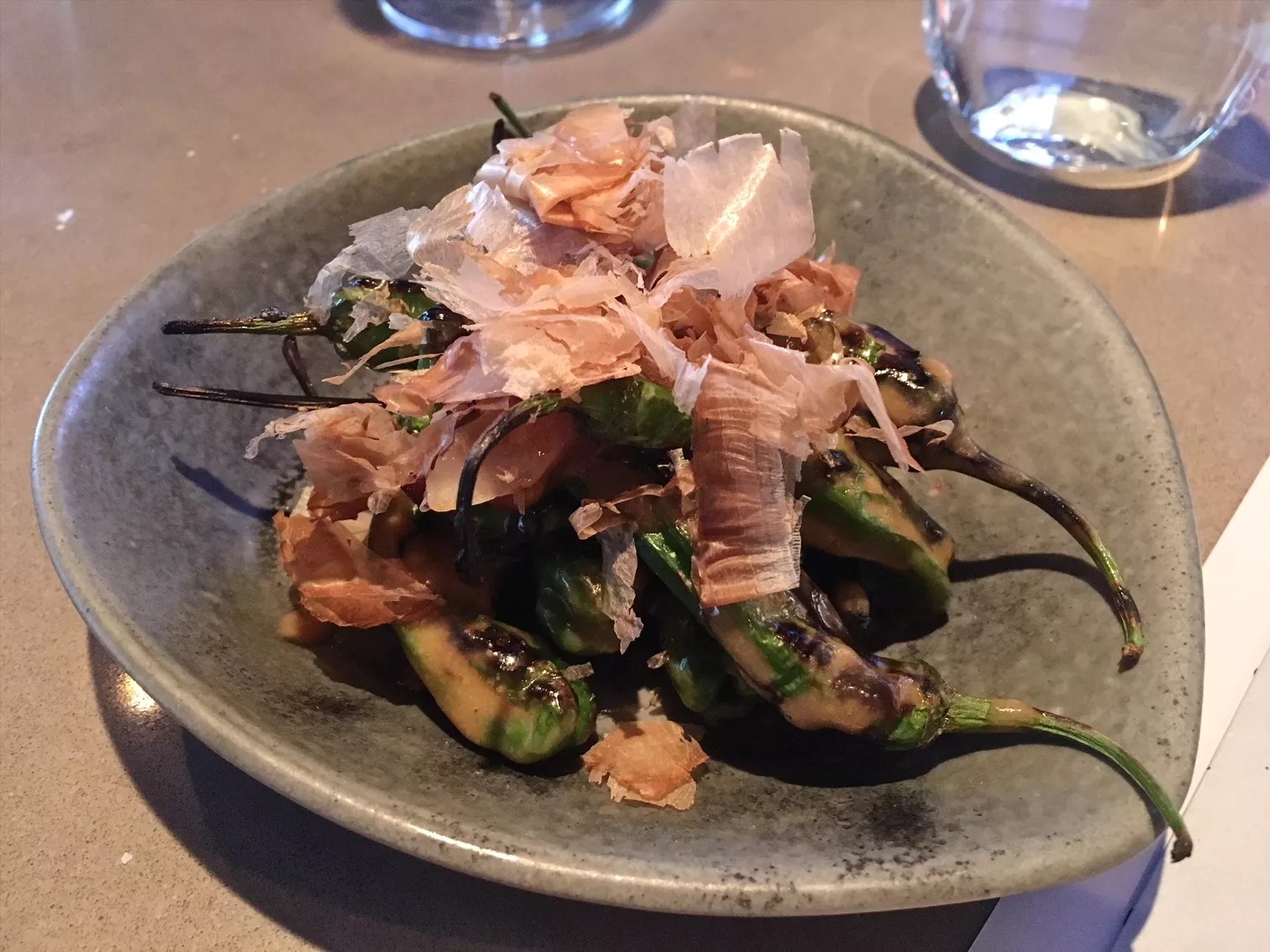 Shishito peppers enhanced by miso butter, bacon and bonito.