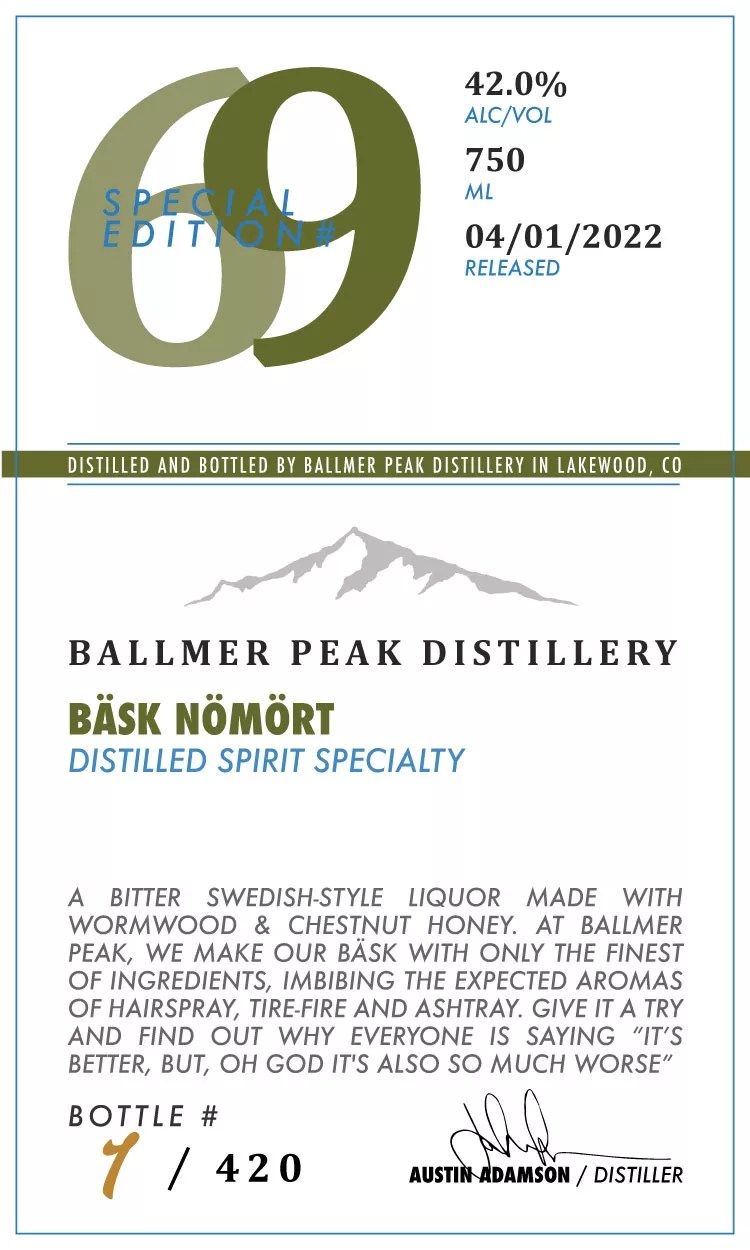 On April 1, Ballmer Peak will debut its special release number 69 (wink, wink), Bäsk Nömört. “Bäsk” is Swedish for “bitter” and is also the Malört style of spirit, while “nömört” is a play on “no more,” which is what you may be saying after trying a sip.