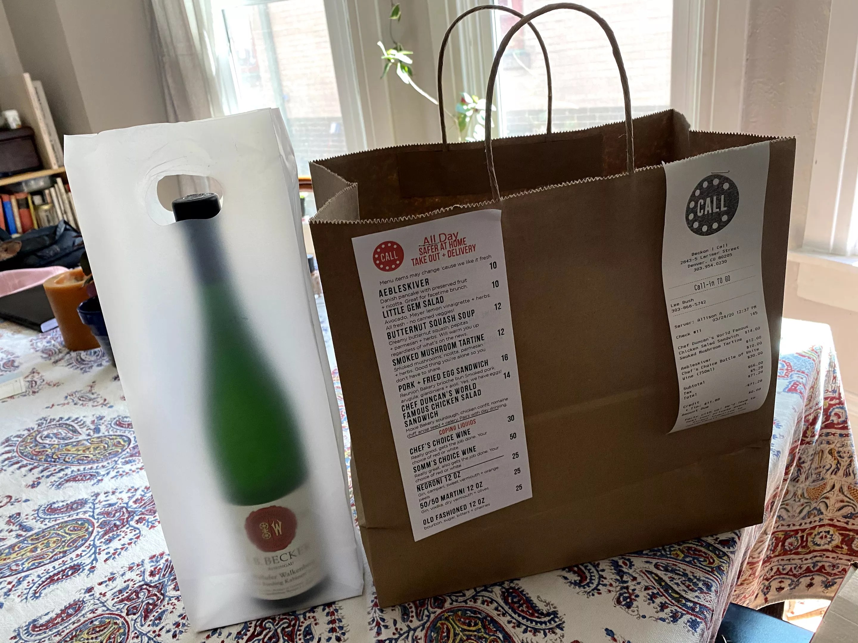 First, let’s talk about the weather. We’re at least fortunate that the weather has been friggin’ gorgeous these past few days. And you know what goes with good weather? A picnic feast, to go. As far as I can tell, Call is doing it right. Walking up to the restaurant for pick-up, I see a sandwich board on the sidewalk but am blocked from entering the interior of the restaurant. Instead, the hand-off is made cleanly, one woman’s gloved hand reaching across the table with my pre-paid paper bag of goodies, and I’m off. It’s amazing (if strange) when distancing truly feels like care and community.