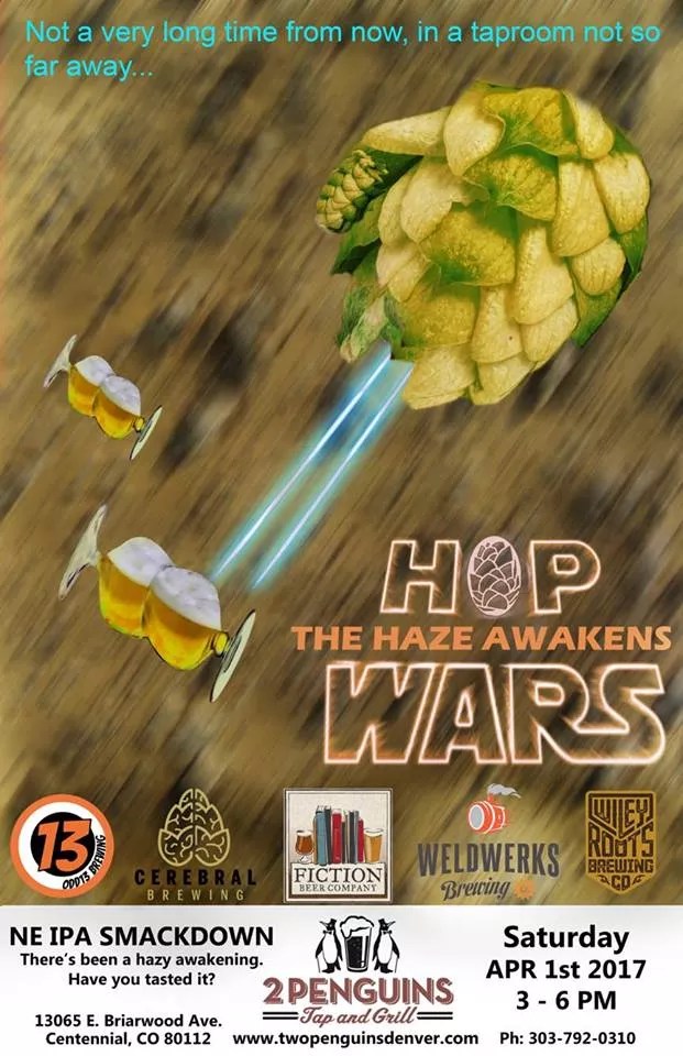 Two Penguins Tap and Grill in Centennial will bring back its Hop Wars today, this time featuring five hazy, New England-style IPAs, which will go toe-to-toe for your love. The Haze Awakens takes place from 3 to 6 p.m and features beer from Cerebral Brewing, Weldworks, Wiley Roots, Odd13 Brewing and Fiction Beer Company.