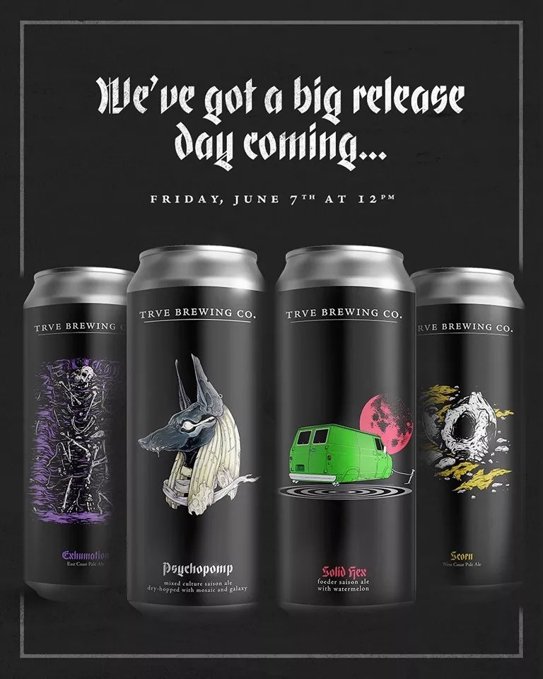 TRVE Brewing is celebrating its seven-year anniversary this month, and will kick things off at noon Friday with the release of four different canned beers. Exhumation is an East Coast pale ale brewed with Citra and El Dorado hops. Scorn is TRVE’s excellent West Coast IPA, brewed with Citra and Mosaic. Psychopomp is a new mixed-culture saison with Mosaic and Galaxy. And Solid Hex is a foeder-aged saison with watermelon.