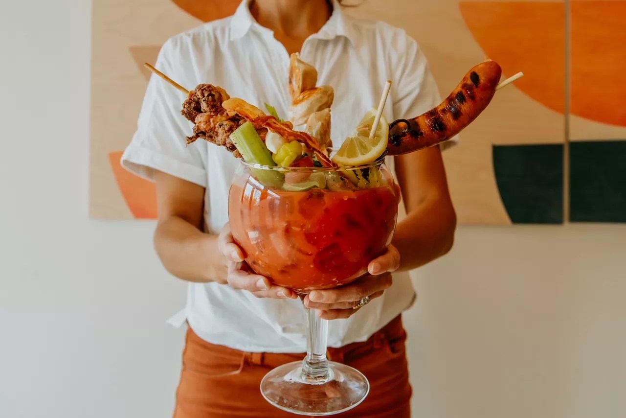 Baba & Pops may be known for its handmade pierogi and other Polish specialties, such as cabbage rolls and smoked kielbasa, but the Bloody Mary here is anything but an afterthought. The Buddy Mary ($48) is named after the owners’ son, and because the drink is so large, you’ll likely need a friend to help take it on. It’s 50 ounces of housemade mix and Polish vodka adorned with three potato and cheese pierogi, an entire link of grilled kielbasa, a fried chicken kabob, two strips of bacon, pickled vegetables, celery, olives, limes, cheese and a charred jalapeño. “We wanted to make a statement with the Buddy Mary and give customers a sampling of our menu at the same time,” Yurek explains. “We want it to be the most memorable and delicious experience you’ve ever had with a Bloody Mary.” Baba & Pops also offers a traditional Bloody for $7.