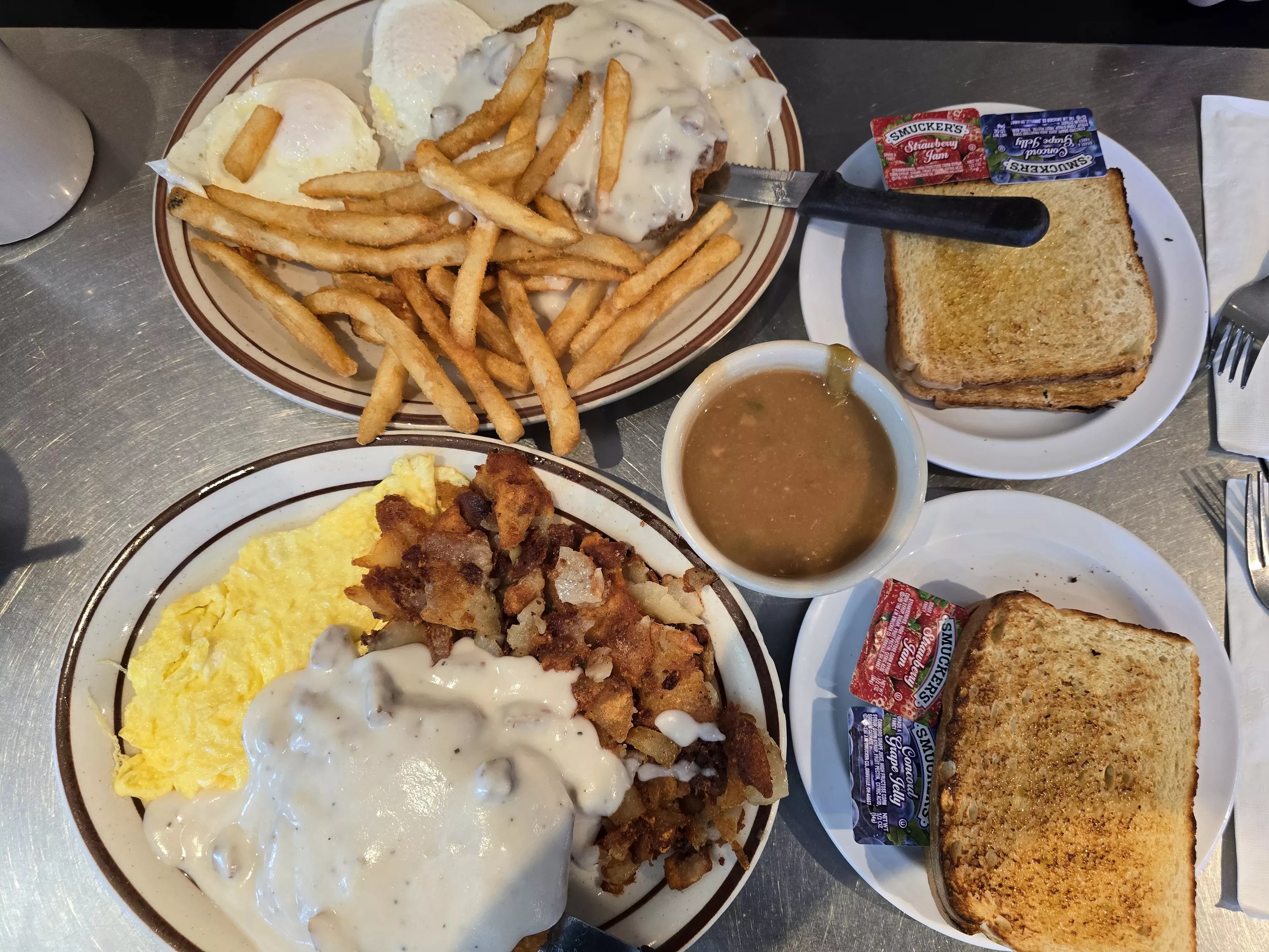 I snapped the two photos above less than a week apart, after Pete’s Kitchen came through for me in the way only an old-school diner can. The first visit was the morning after this year’s Michelin ceremony. I’d ended up at an after-party, woke up with a flash tattoo of a chef’s knife (no regrets) and desperately needed fuel for the day. Pete’s provided just that in the form of chicken-fried chicken with extra crispy hash browns and a side of green chile.
