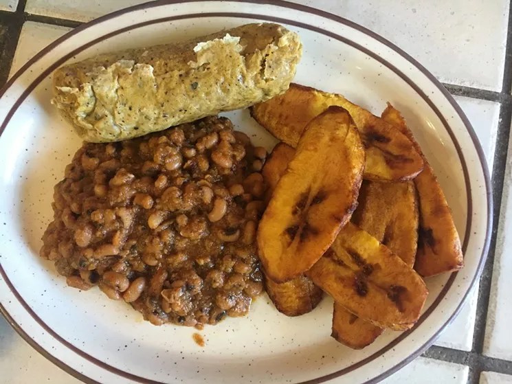 Red red, a Ghanaian dish of stewed black-eyed peas served with plantains and a steamed cake called moi moi. This version is courtesy of African Grill and Bar.