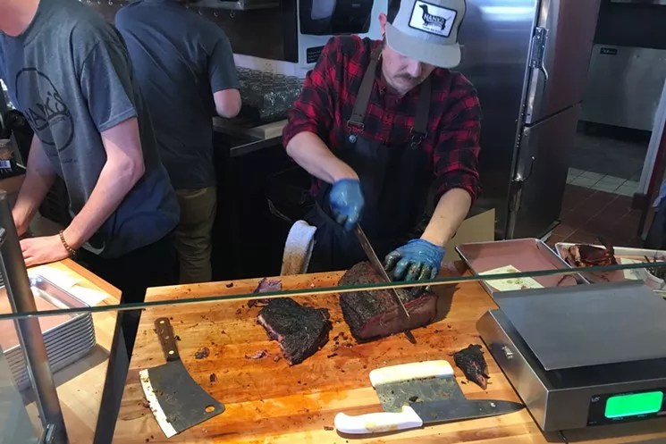 Hank’s owner Chris Nicki slices his smoked brisket.