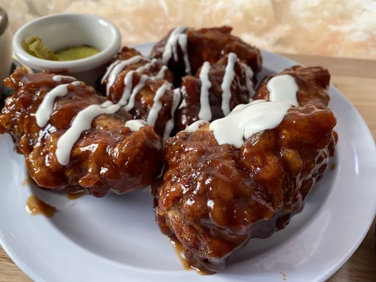 Raspberry mango habanero wings from Genna Rae’s are sweet and crispy with mild heat.