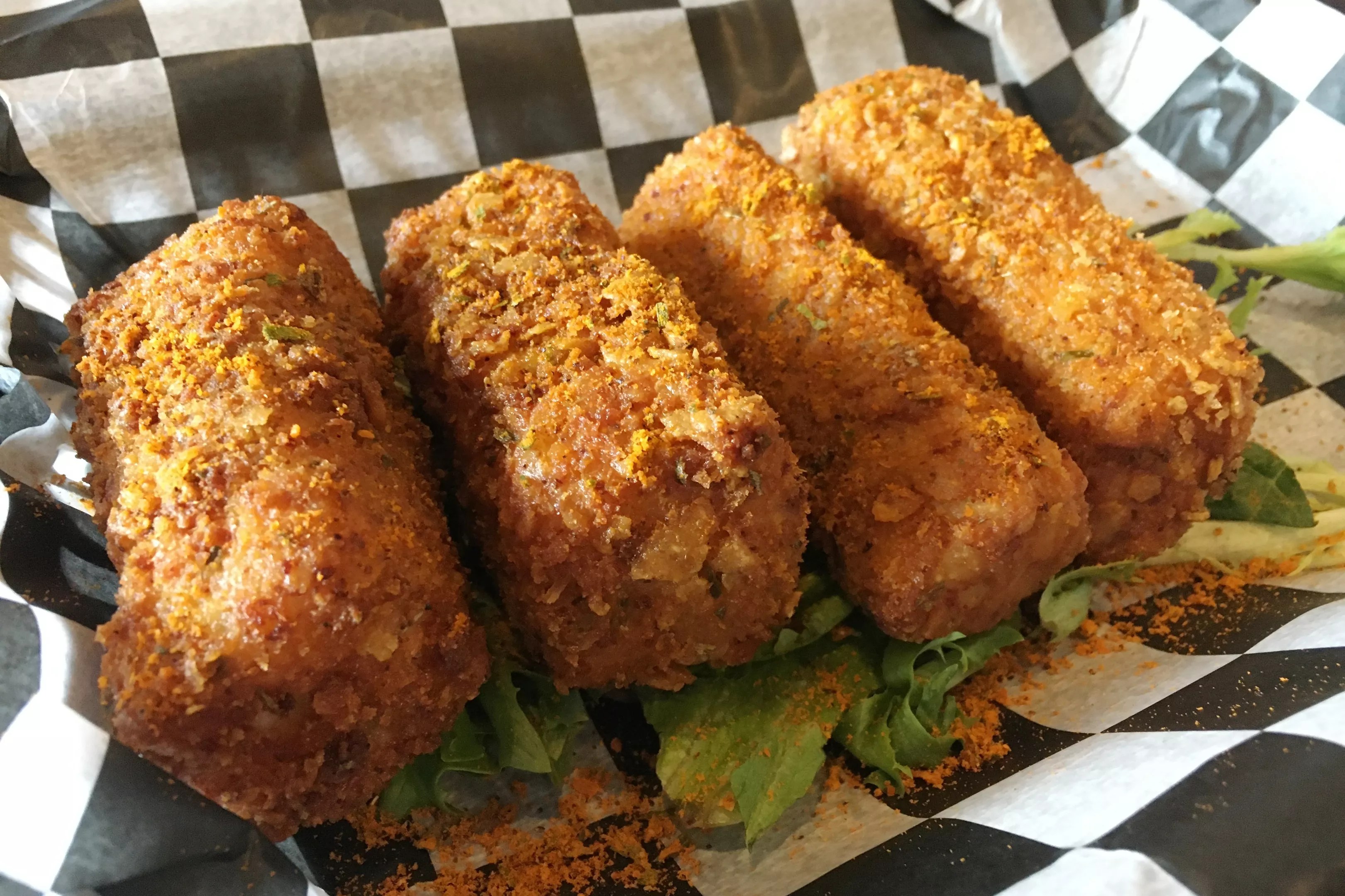 Also new at Biker Jim’s is a nacho-cheese variation of the eatery’s fried mac and cheese. The cheesy squares are riddled with bacon and chiles and encrusted in a nacho-cheese tortilla coating. Be sure your estate is in order before you combine these with anything else on the menu.