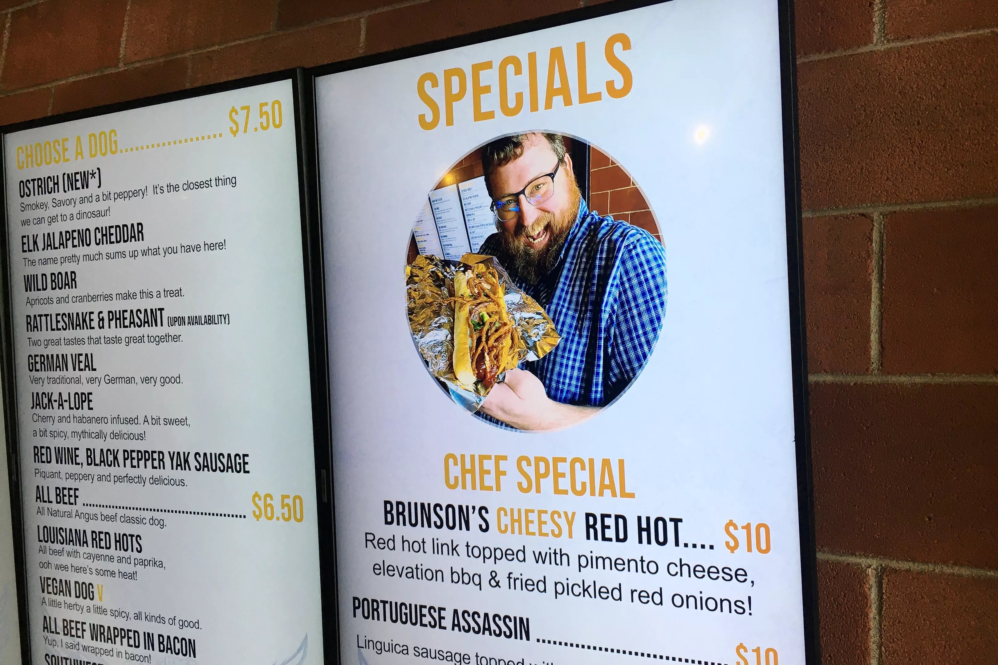You know you’re big when your wiener shows up on Biker Jim’s menu.