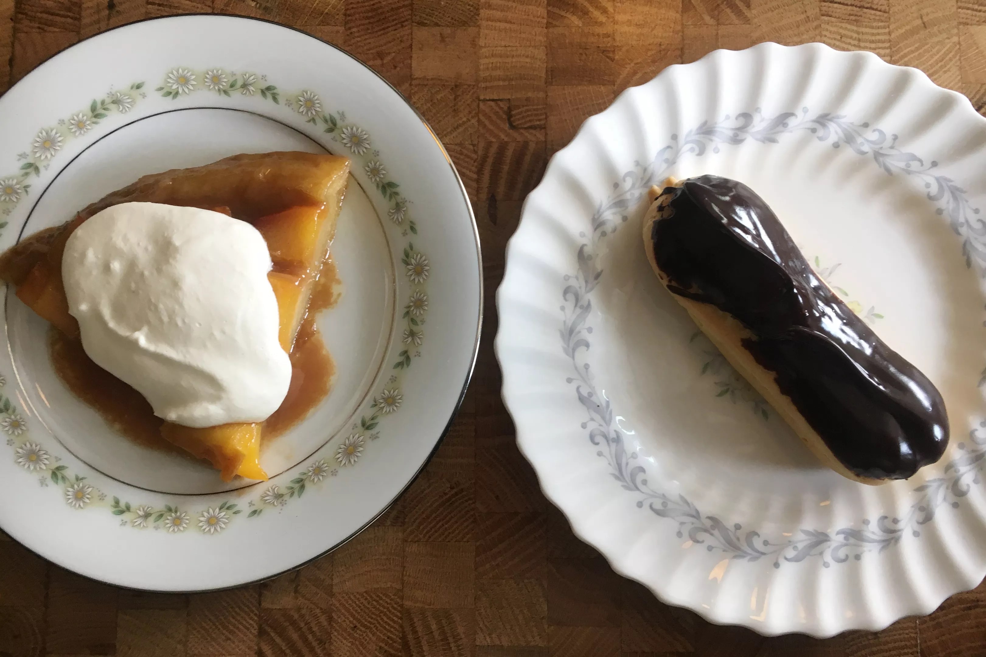 Other house specialties include a Lyonnaise salad with bacon and a poached egg; jambon-buerre, the quintessential French ham sandwich; and a fried-chicken plate with pain perdu (that’s French toast to Americans) and syrup. For dessert there’s a chocolate eclair piped with vanilla creme, or a traditional tart tatin, a type of pie that’s cooked upside down in a pan before being flipped onto a platter to expose the caramelized fruit. Leon is using Palisade peaches for opening week, but will likely phase into apples as fall approaches.