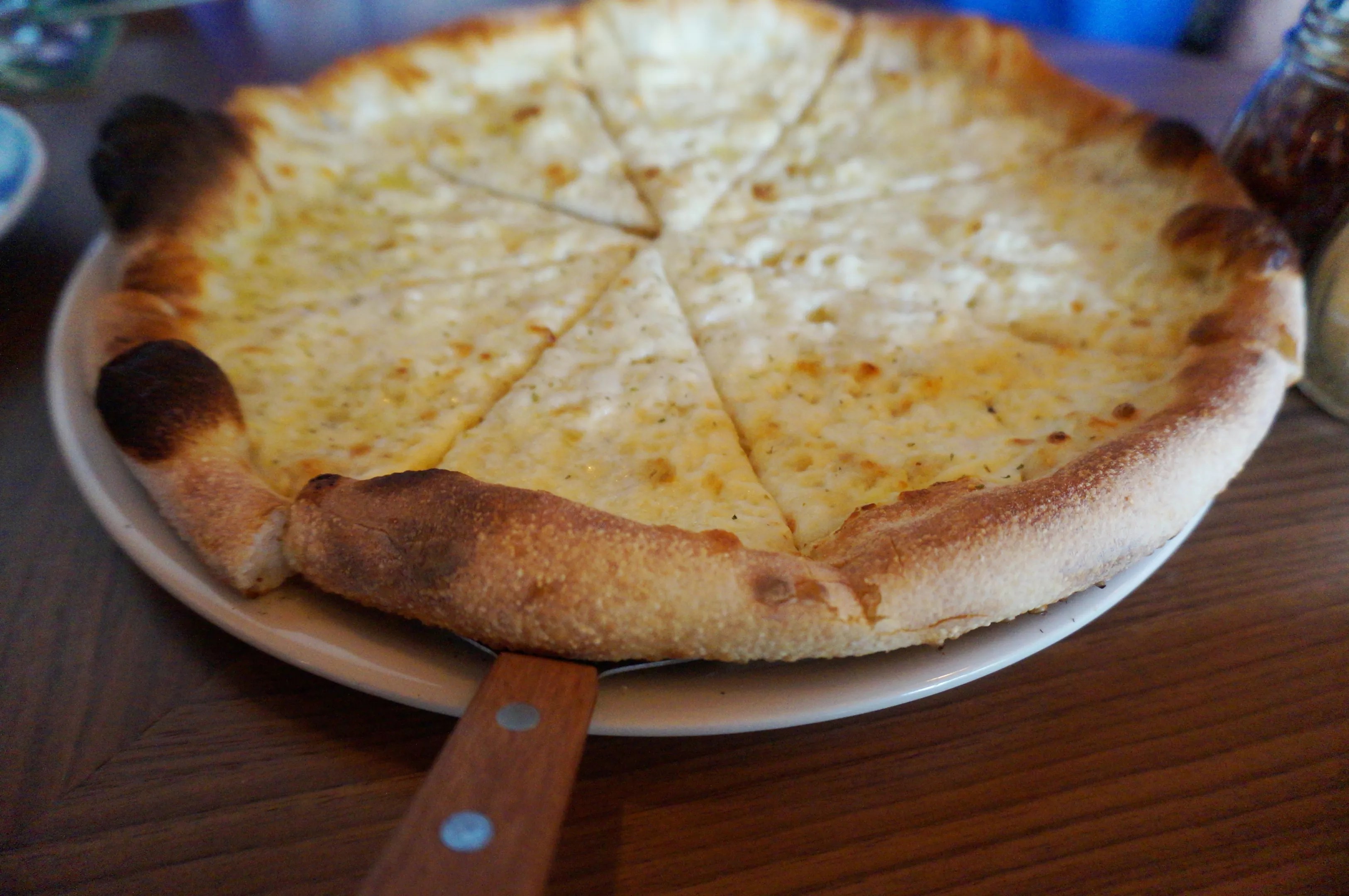 Blue Pan’s new white pizza served on an Italian crust.