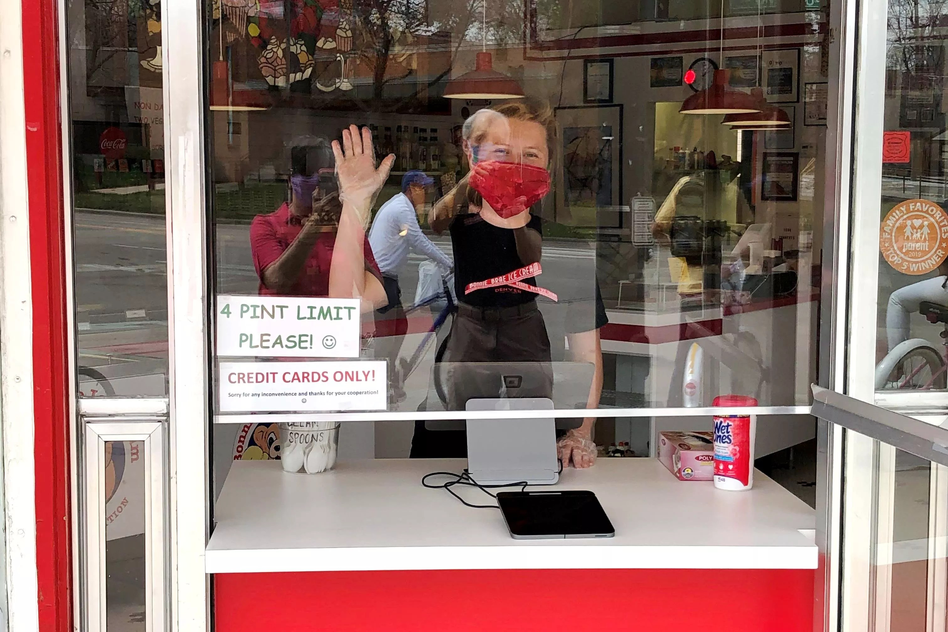 The other main difference is that Bonnie Brae Ice Cream is only offering walk-up service for now. Bob explains that they were able to cut a panel out of one window and fit it with a service counter, and they also placed a wheeled checkout stand at the front door, with a plexiglass divider that maintains some separation between employees and customers. “The foremost thing is the safety of our public and our staff,” the owner adds.