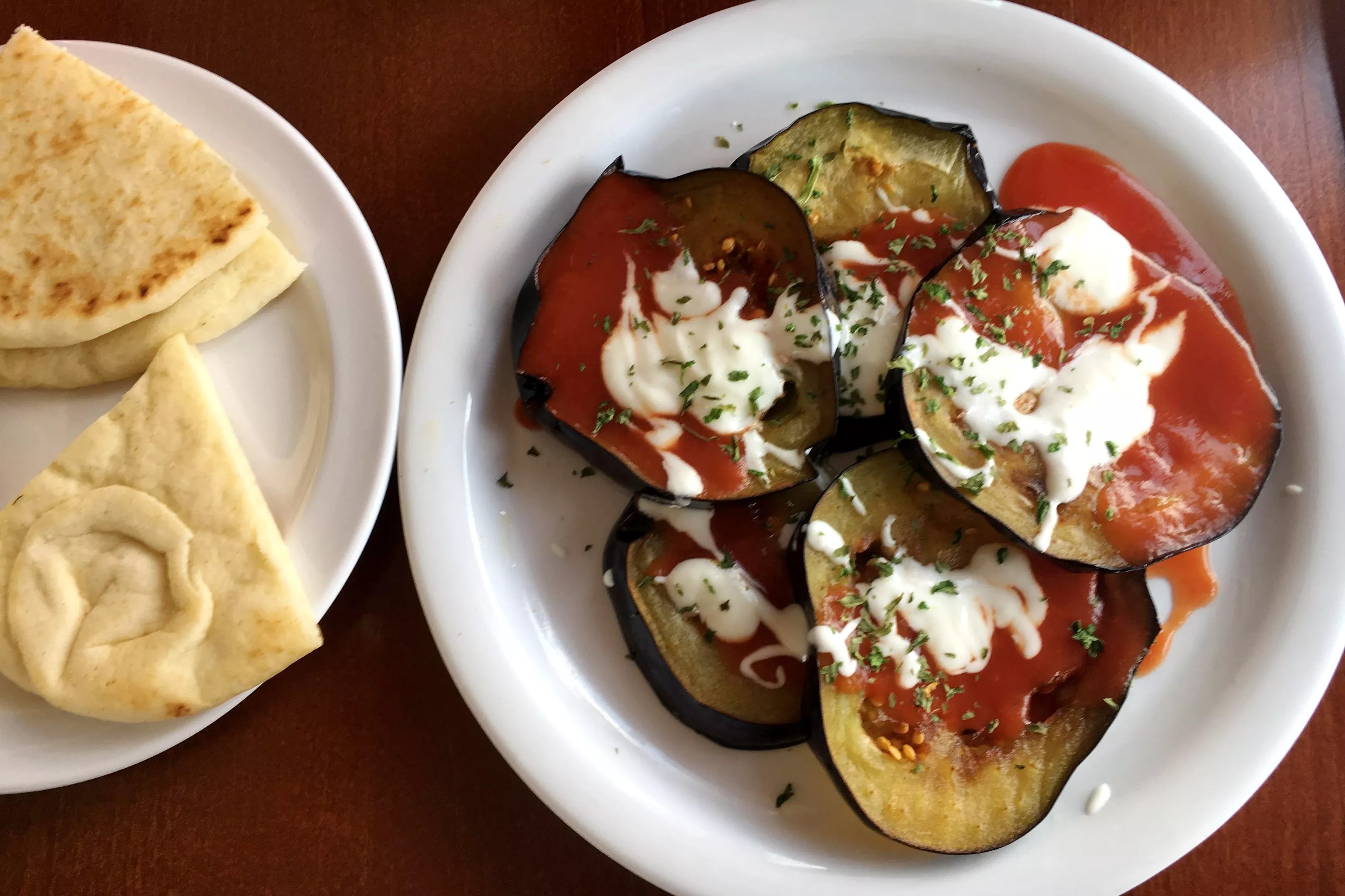 Grilled eggplant is served as an appetizer or in a veggie sandwich with falafel and stuffed grape leaves.