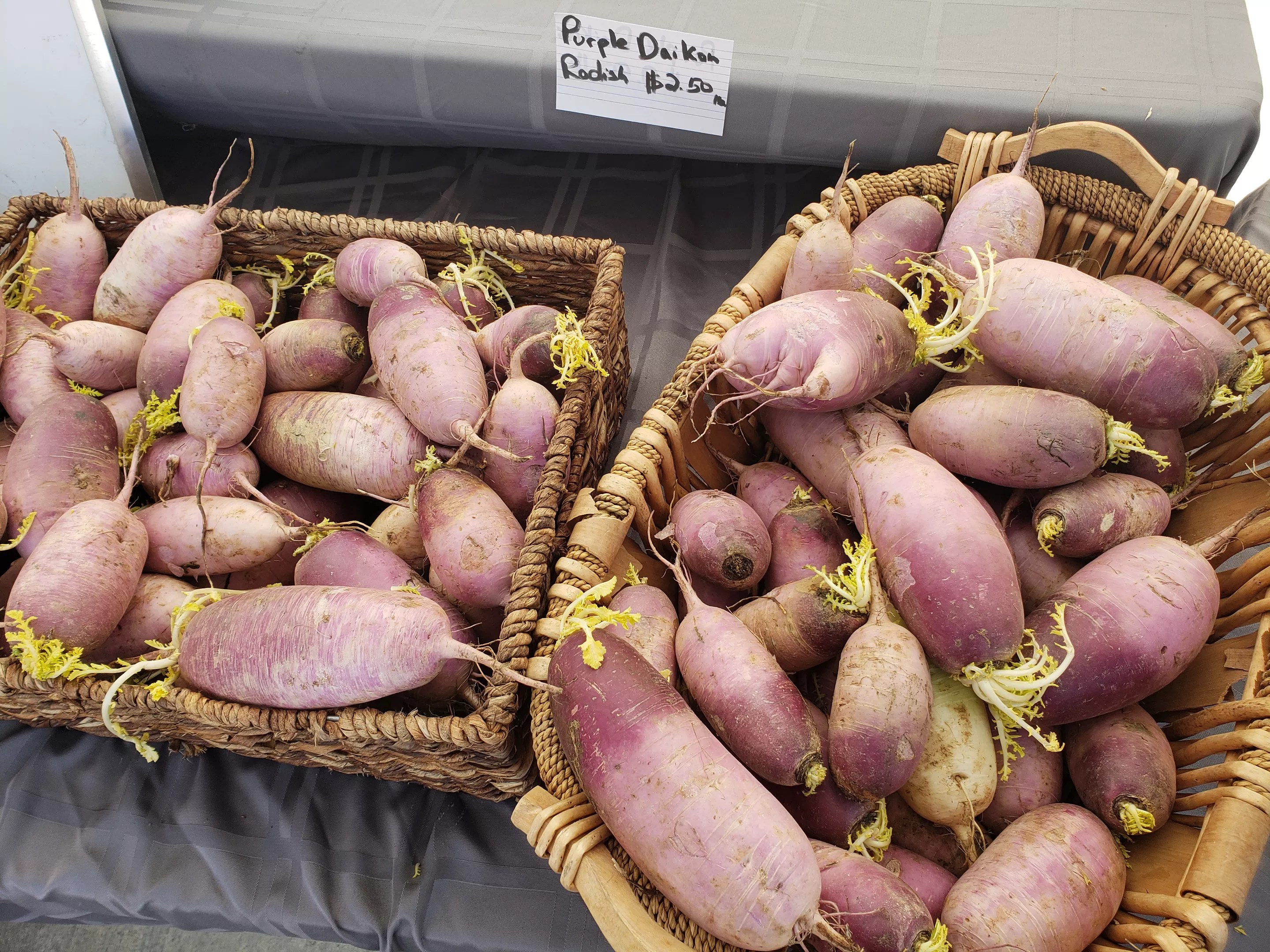 Over at Aspen Moon Farm, the highlights included black radishes, several carrot varieties and beautiful orbs of yellow onions that looked almost too perfect to eat. Toohey & Sons Organic, which is only doing the Boulder market this year, had an abundance of lettuce, and Honeyacre Enterprises offered hothouse green beefsteak tomatoes and one lone red one. The mushrooms at Hazel Dell Mushrooms proved bountiful, and Ollin Farms offered plenty of pretty purple daikons.
