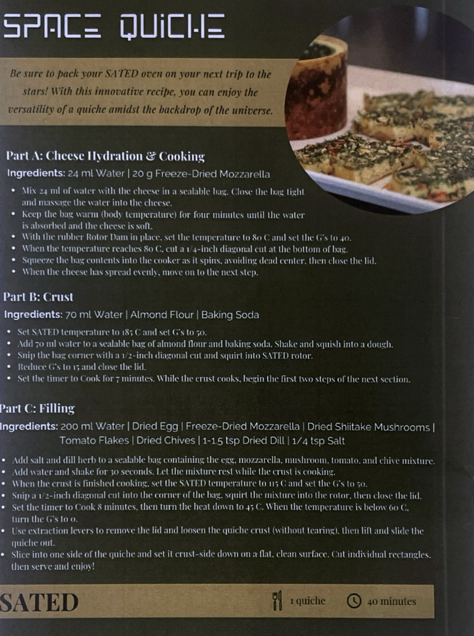So Sears and SATED need a lot of attention, money and time to succeed, which is why Sears is looking forward to partnering with Florence and Andrés to develop recipes. Those partnerships can lead to grants and sponsorship money, educate politicians and government officials about his technology, and bring a broader awareness of the possibilities of cooking in space. The more space quiches, space pizzas and space cakes made and consumed on Earth, the higher the possibility that one day they’ll be consumed by astronauts, giving them a small taste of home while they’re in outer space.