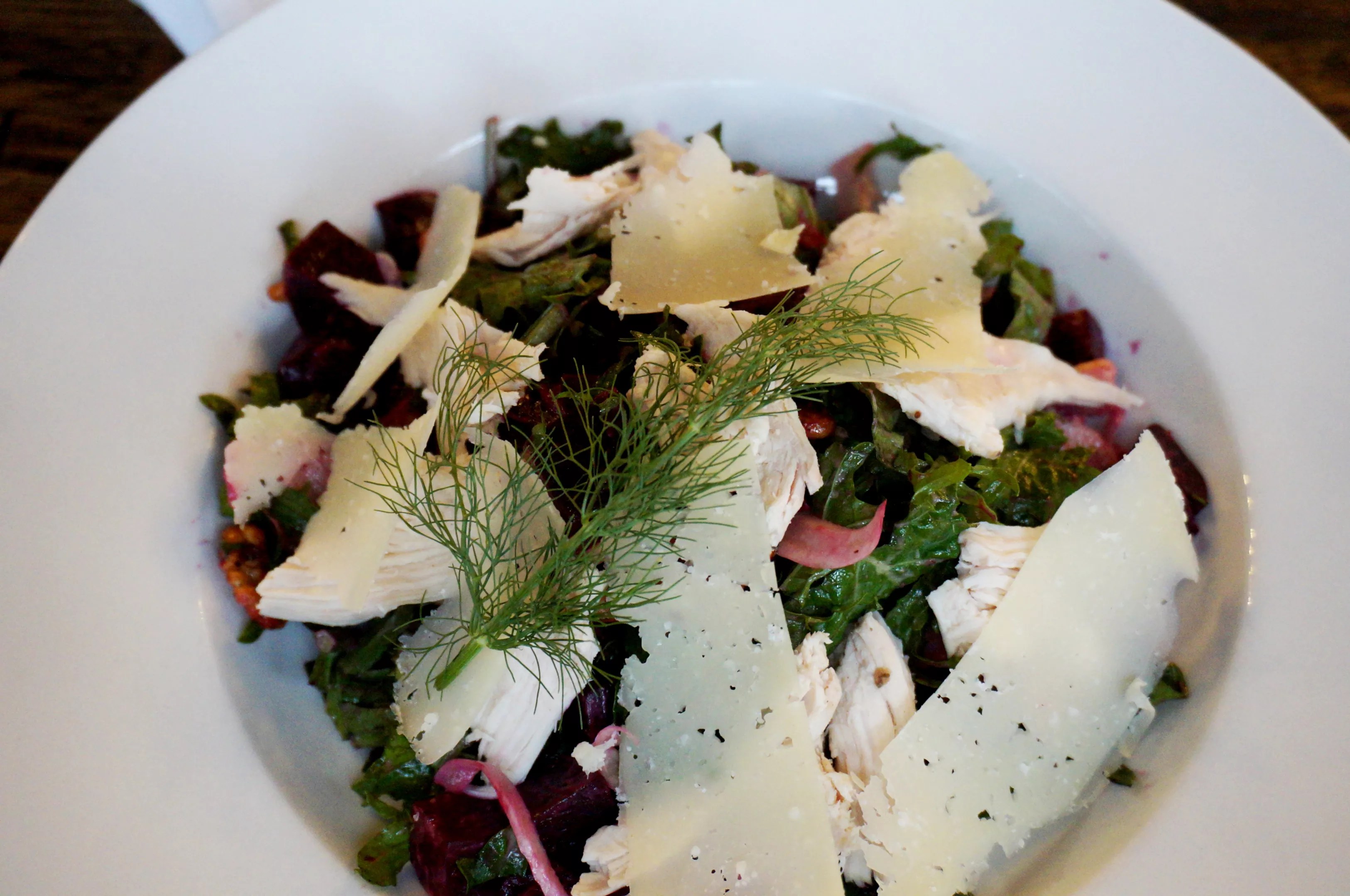 Chef Isabel Ranney makes kale and beets a little more lively with shaved fennel, rotisserie chicken, candied walnuts, curls of Manchego cheese and charred-lemon vinaigrette.