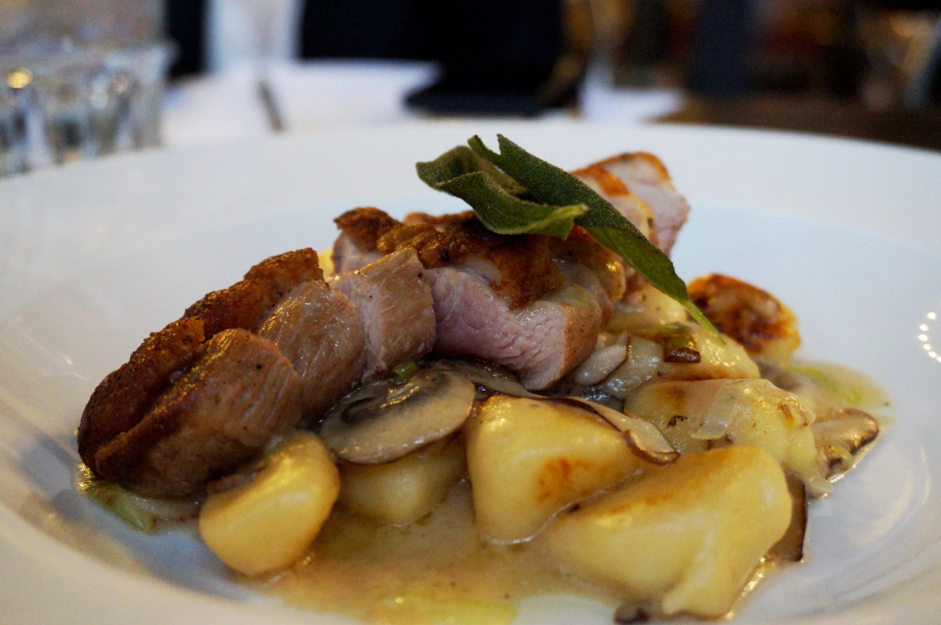 Gnocchi and duck breast with leek-and-mushroom ragout.