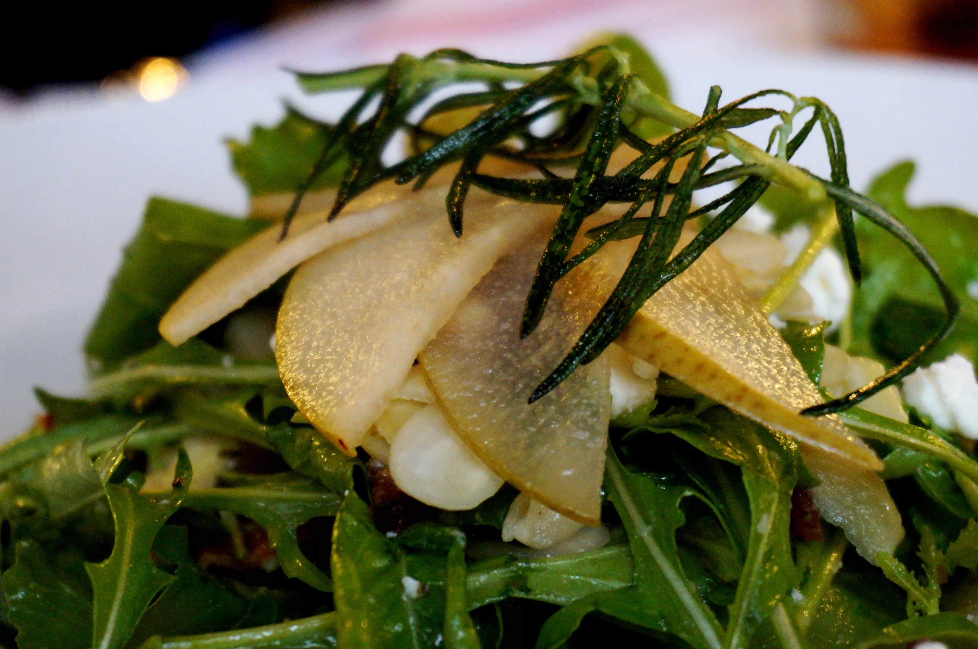 An arugula salad gets a bright cap of pickled pears and tarragon.