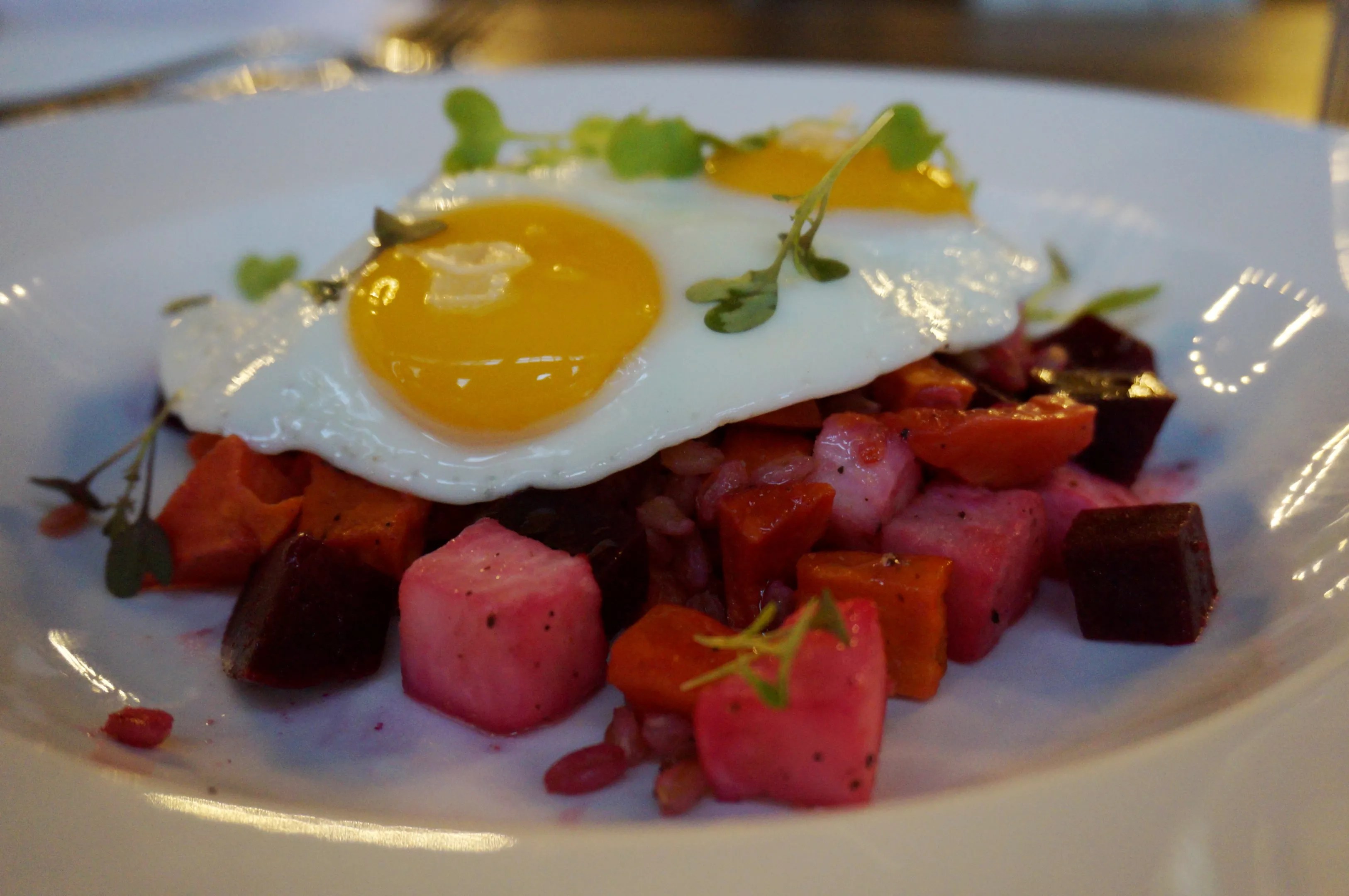 A farro bowl with roasted root vegetables is topped with a couple of eggs done sunny-side up.