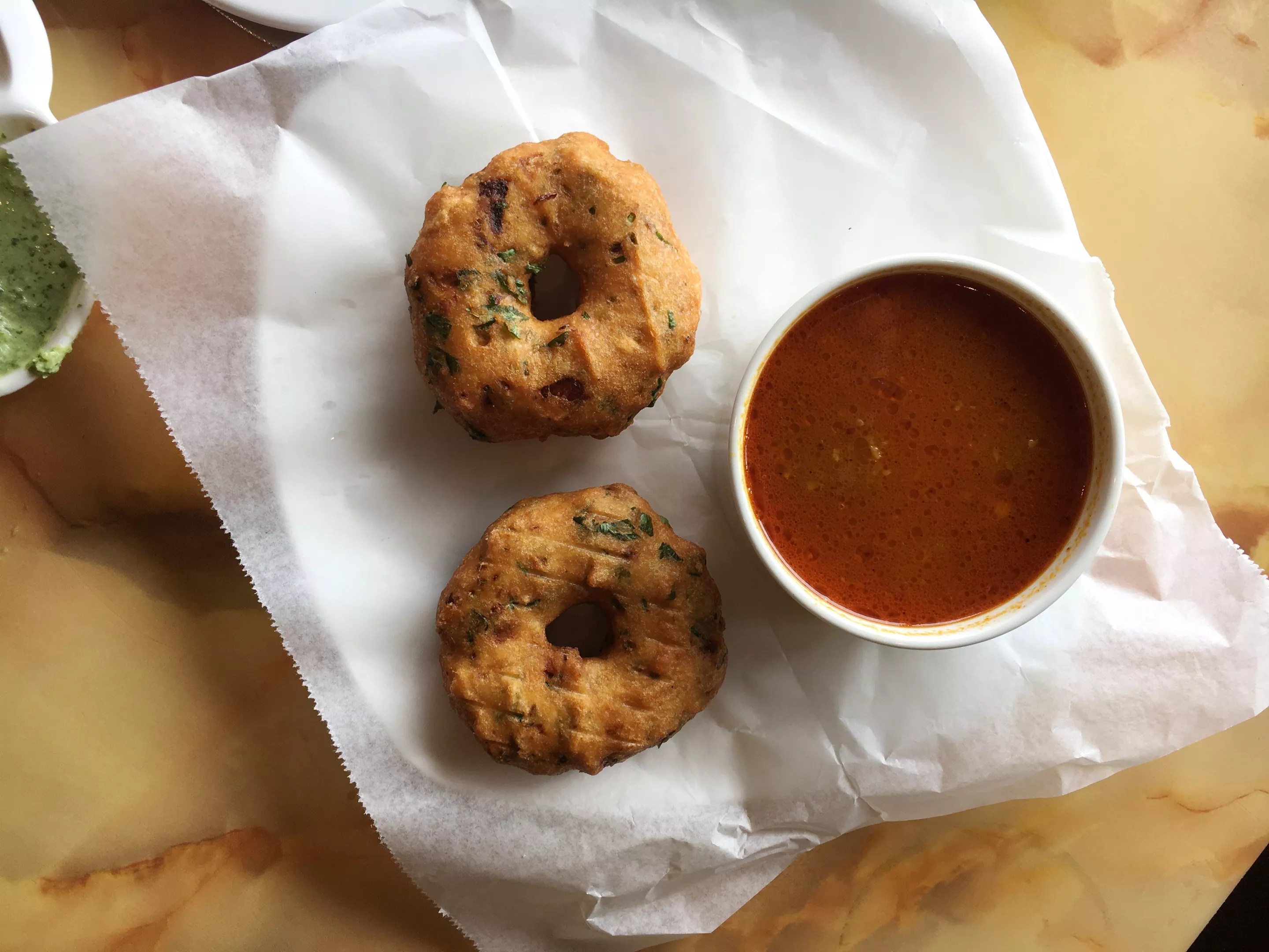Doughnut-shaped vada are great when dunked in the spicy side of sambhar.