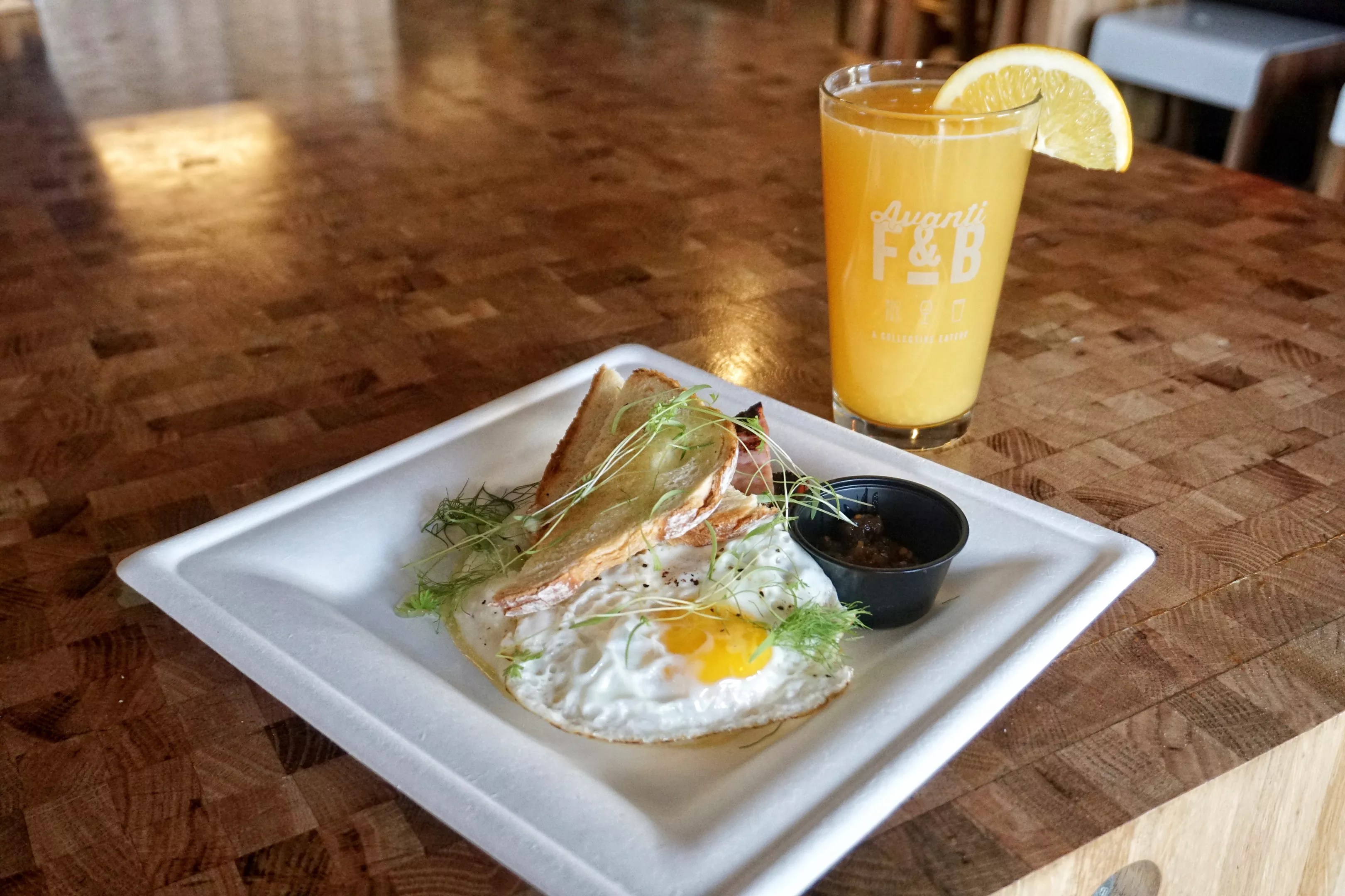 When it came to developing the recent brunch beverages, the bar team worked closely with the in-house food vendors, whose chefs are on call to consult with patrons about which bite goes best with which booze, and vice-versa. However, don’t expect Avanti F&B to pour bottomless rounds any time soon. “While the bottomless mimosa is not lost on us, we have a big space and are family-friendly during most hours, so we decided against it,” the bar manager notes. Fret not: You won’t miss your mimosa fix, thanks to signature Bloody Marys, micheladas, spiked OJ and more. Too hung over to do the legwork in figuring out which potion goes best with which plate? We joined forces with Avanti F & B to create a top-notch pairing list just for you.
